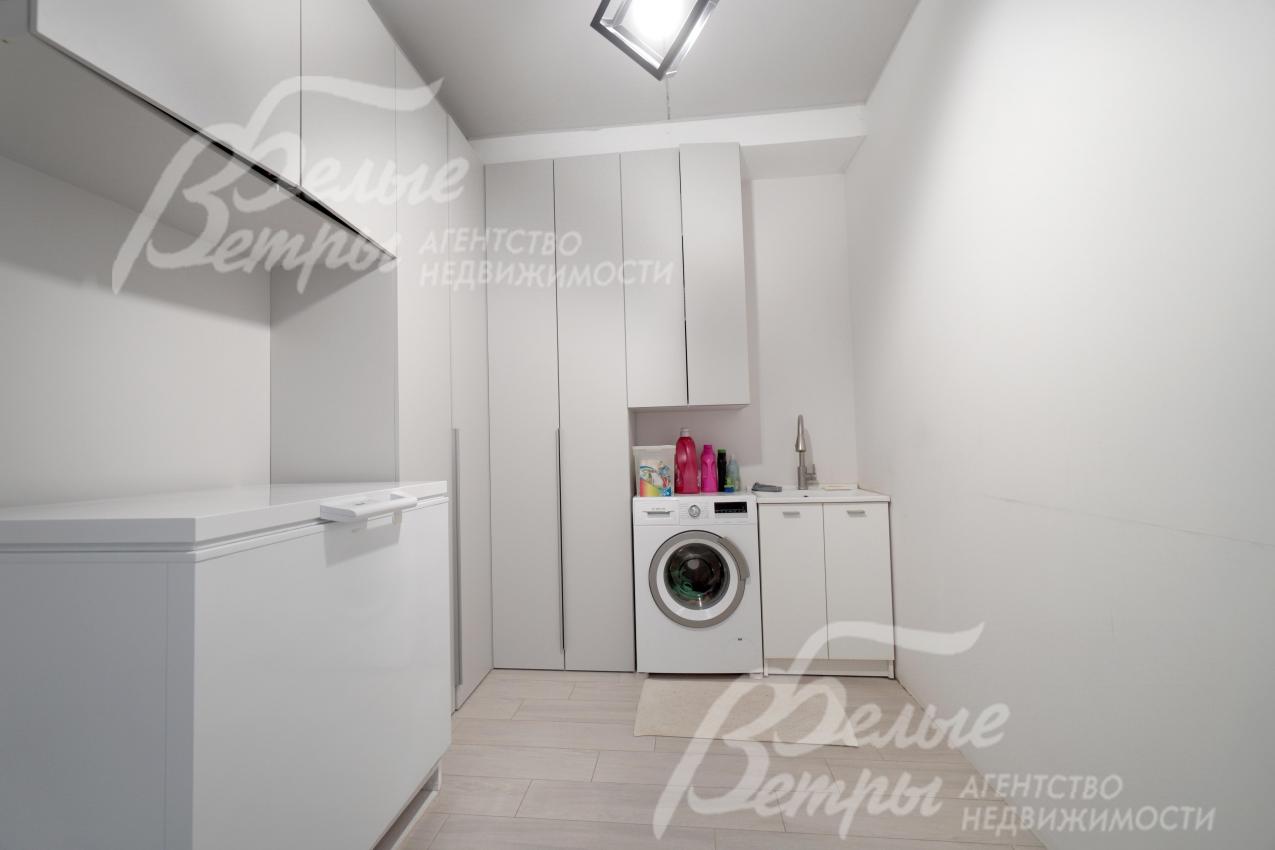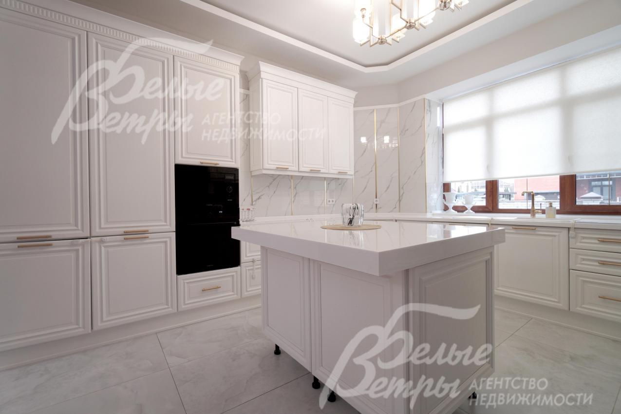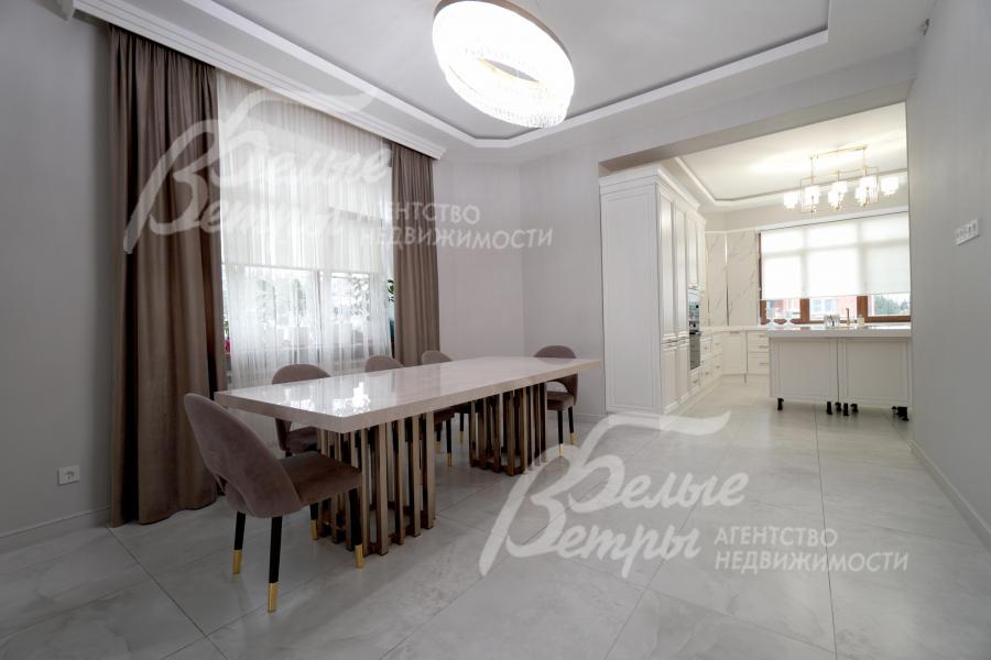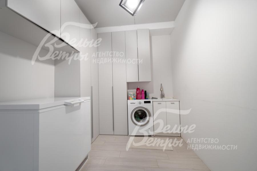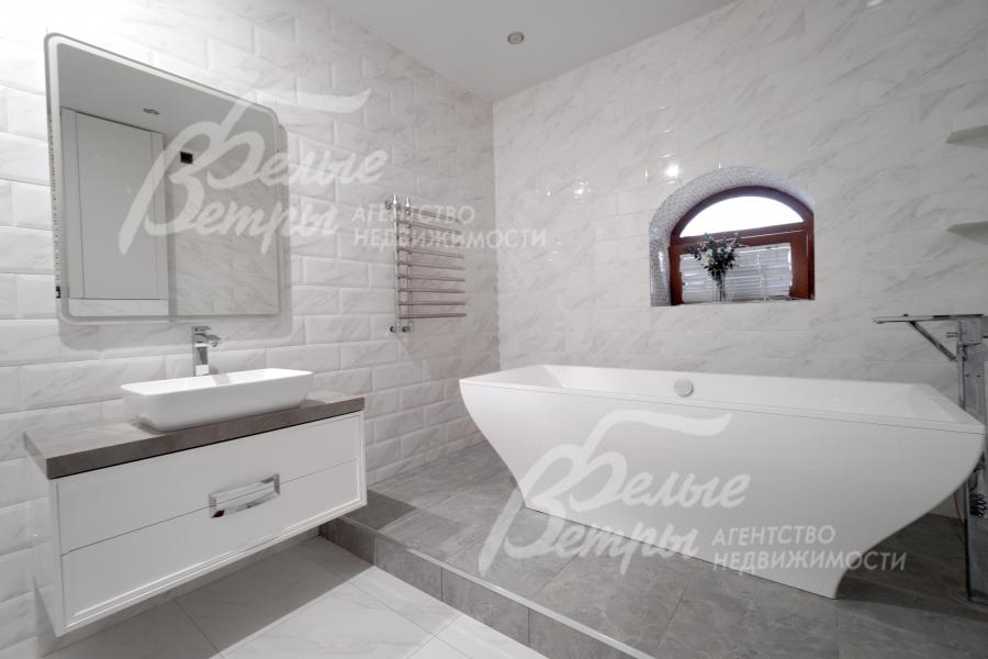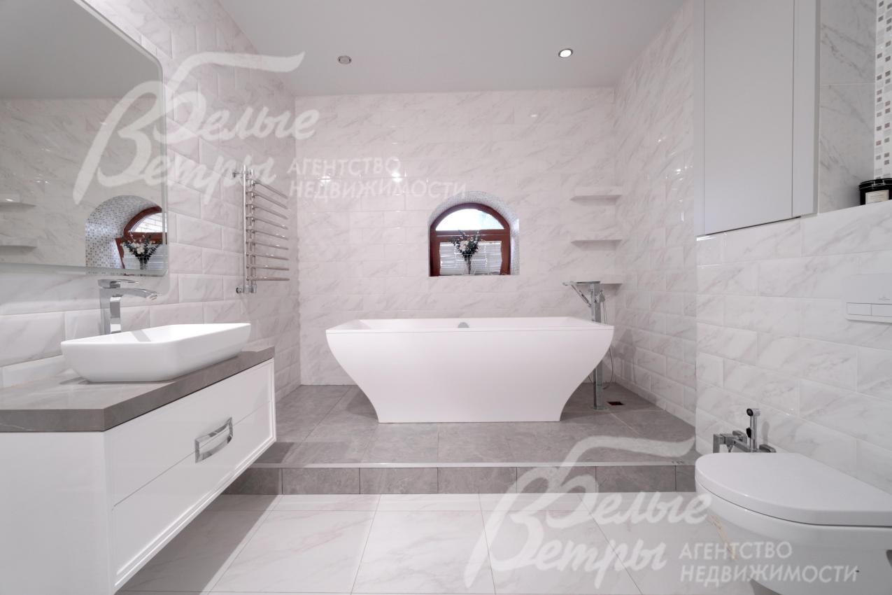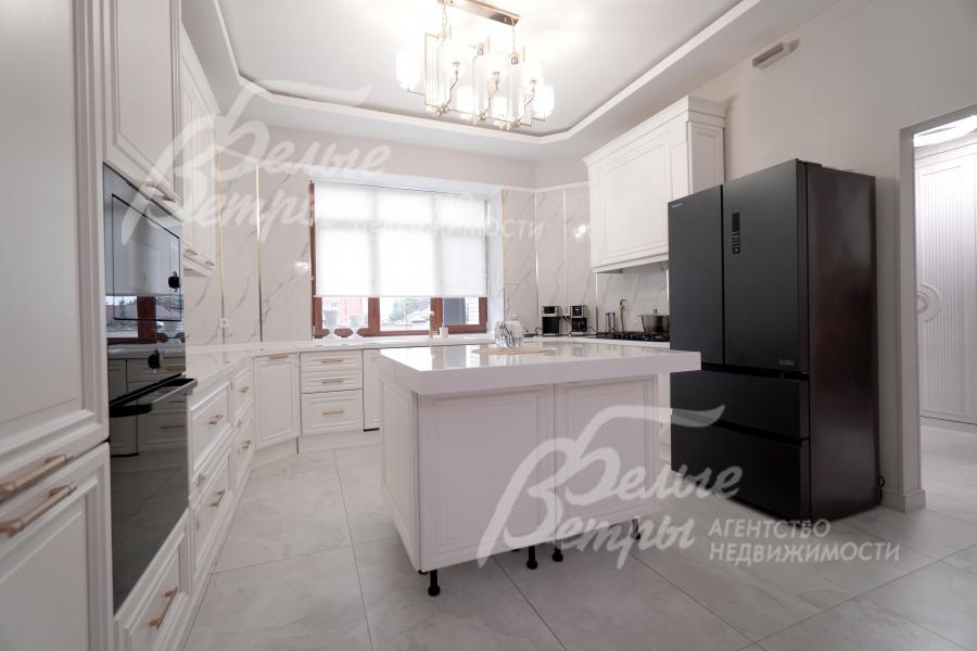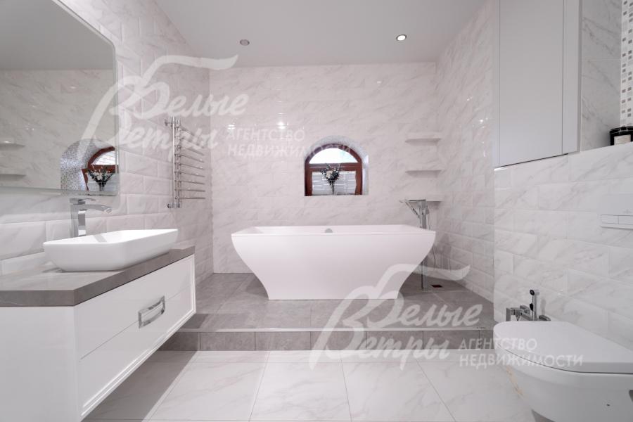 Мебель, оборудование: интерьер дома укомплектован фирменной мебелью российского и итальянского производства. Корпусная мебель изготовлена из массива дерева, встроенные шкафы – также из массива дерева с эмалированным покрытием, в спальне – итальянские диваны. На кухне – гарнитур в классическом стиле из массива ясеня (толщина фасадов 22 мм, фурнитура BLUM) с островом, столешница из искусственного камня, встроенная техника Gorenje, широкий холодильник TOSHIBA и морозильник Liebherr. В столовой – обеденная группа на 8 персон, стол из слэба мрамора. Интерьер помещений дополняют люстры, настенные светильники и шторы. В санузлах установлена вся сантехника и смесители преимущественно брендов Villeroy & Boch, в одном из санузлов – дорогостоящая ванна Villeroy & Boch La Belle. Комплектация дома мебелью обсуждается индивидуально