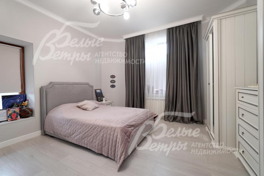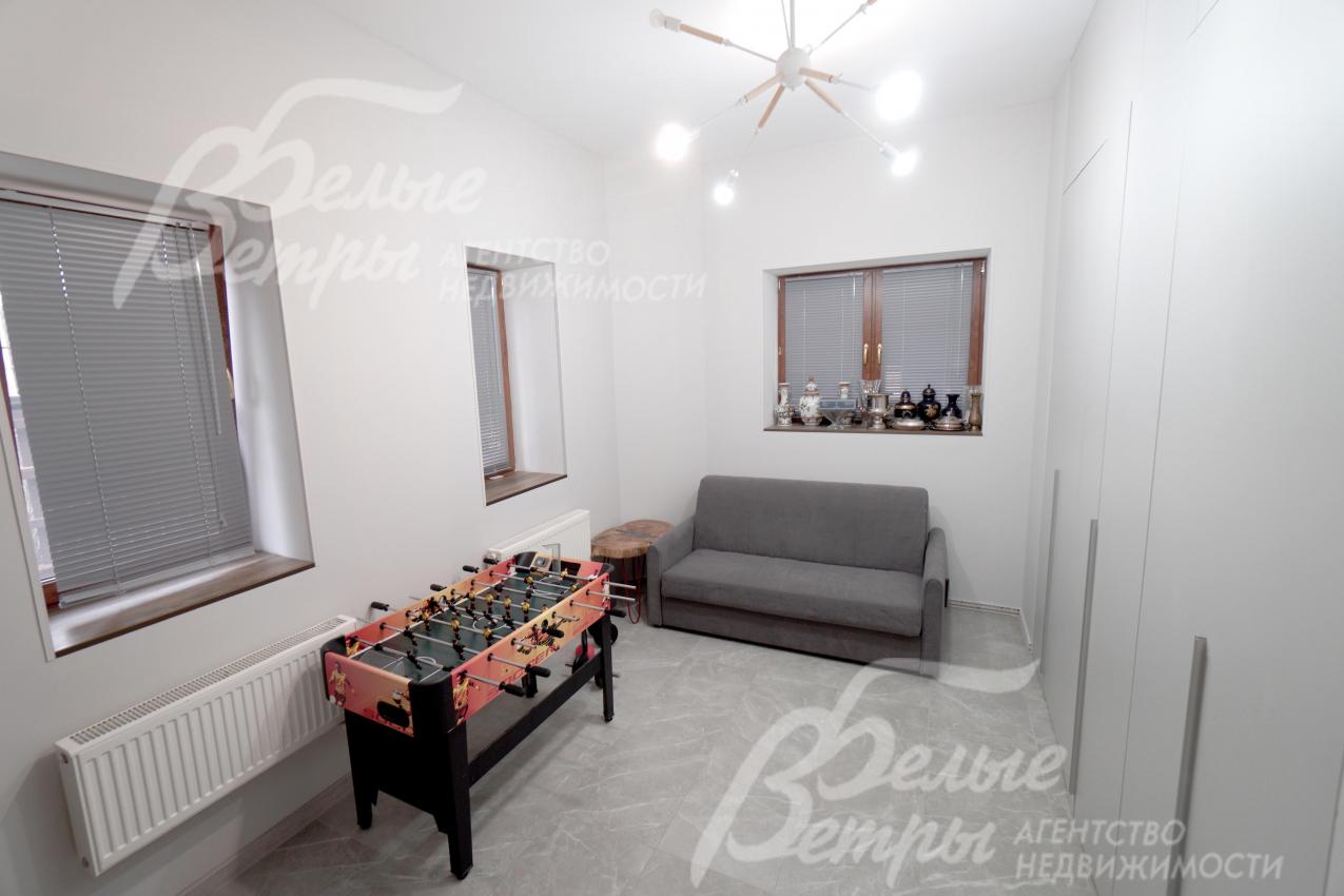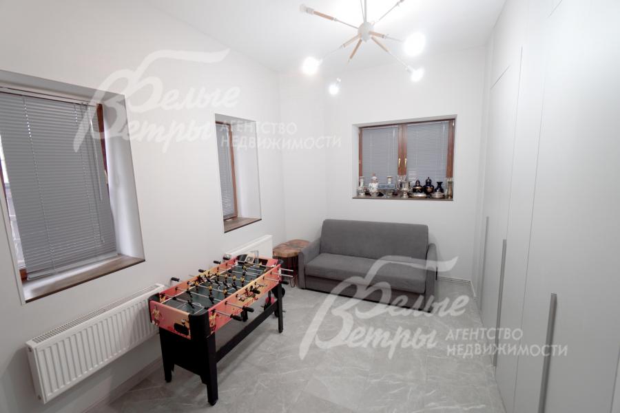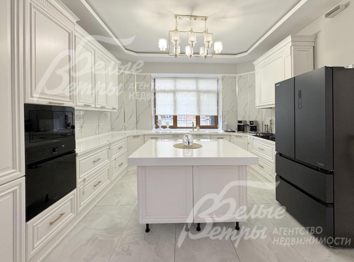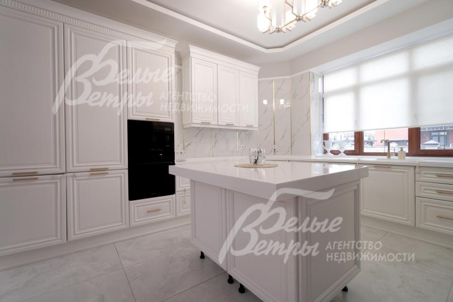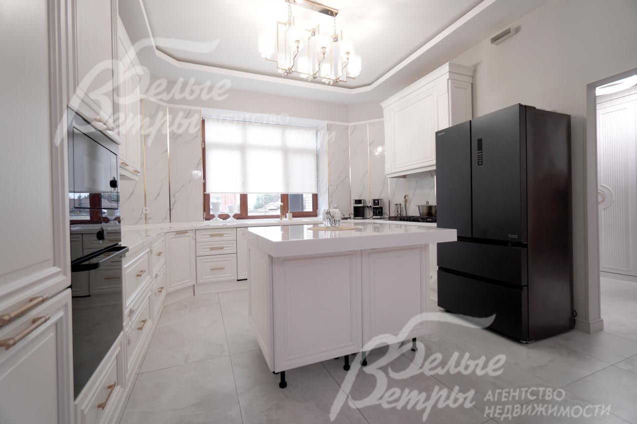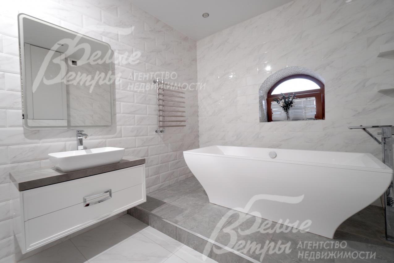 Мебель, оборудование: интерьер дома укомплектован фирменной мебелью российского и итальянского производства. Корпусная мебель изготовлена из массива дерева, встроенные шкафы – также из массива дерева с эмалированным покрытием, в спальне – итальянские диваны. На кухне – гарнитур в классическом стиле из массива ясеня (толщина фасадов 22 мм, фурнитура BLUM) с островом, столешница из искусственного камня, встроенная техника Gorenje, широкий холодильник TOSHIBA и морозильник Liebherr. В столовой – обеденная группа на 8 персон, стол из слэба мрамора. Интерьер помещений дополняют люстры, настенные светильники и шторы. В санузлах установлена вся сантехника и смесители преимущественно брендов Villeroy & Boch, в одном из санузлов – дорогостоящая ванна Villeroy & Boch La Belle. Комплектация дома мебелью обсуждается индивидуально