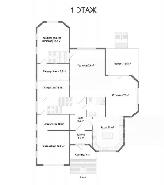 1-ый этаж: крыльцо 5 кв.м, тамбур 4,5 кв.м, холл 11,5 кв.м, гостиная 26 кв.м, кухня 18 кв.м, столовая 20 кв.м с выходом на террасу 15,5 кв.м, санузел 5 кв.м, сауна 5,5 кв.м, душевая 3 кв.м, комната отдыха (игровая) 15,5 кв.м, гардеробная 12,5 кв.м (можно переделать под гараж), постирочная 10 кв.м, котельная 7,5 кв.м