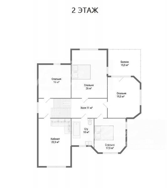 2-ой этаж: холл 11 кв.м, спальня 26 кв.м с балконом 15,5 кв.м, спальня 19,5 кв.м, спальня 17,5 кв.м, спальня 16 кв.м, кабинет 22,5 кв.м, санузел 10 кв.м