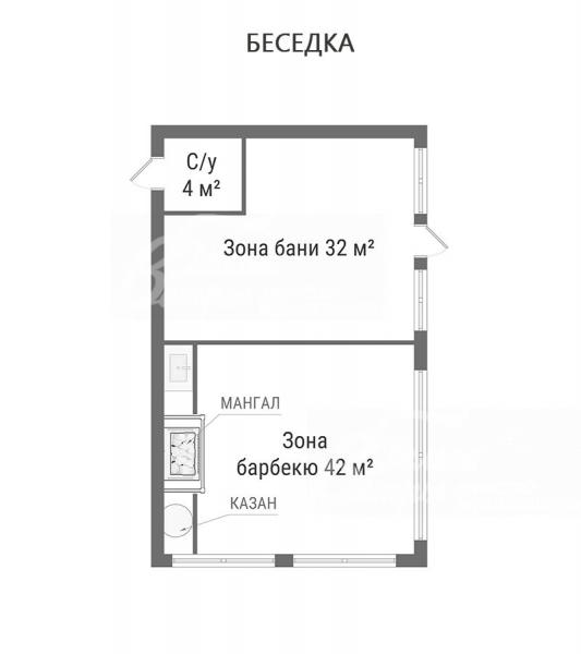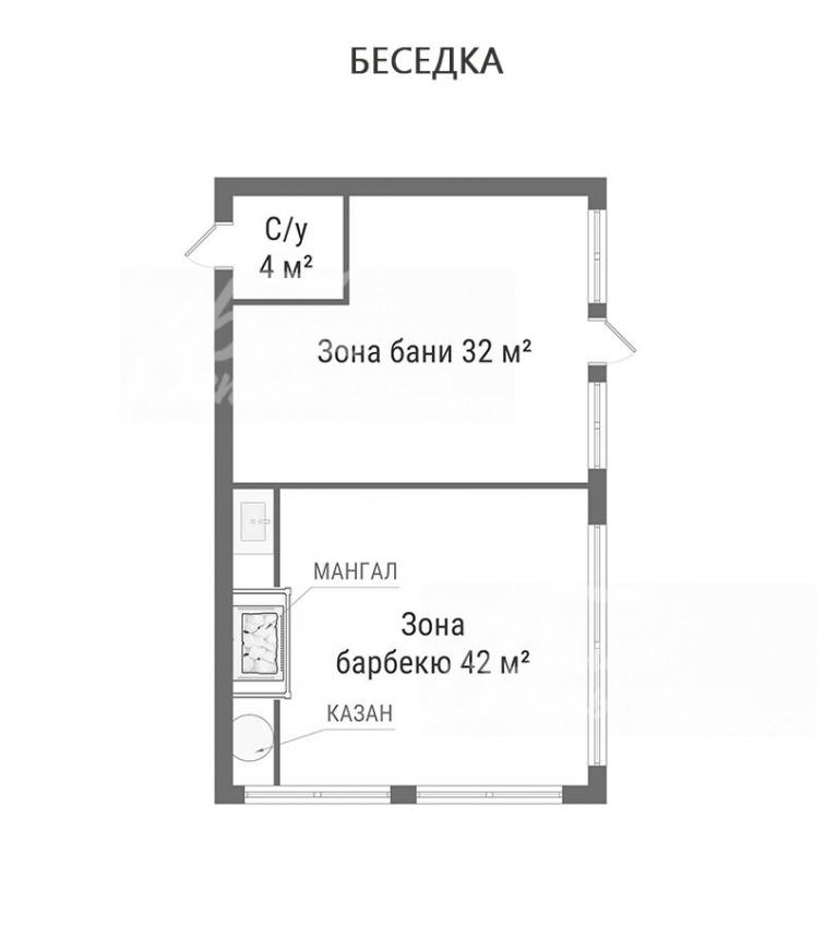 Дополнительные строения: навес для двух автомобилей 6×8 м с хозяйственным блоком 2,5×6 м. Беседка 72 кв.м (фундамент – монолитная плита с прочностными характеристиками под двухэтажный дом) с зоной бани и закрытой зоной для барбекю с установленными мангалом и казаном, также есть раковина, столешница из керамогранита, электрические тёплые полы, панорамные окна с откатным механизмом (под отделку, зона бани – 32 кв.м, зона барбекю – 42 кв.м, коммуникации разведены, запланирован санузел 4 кв.м)