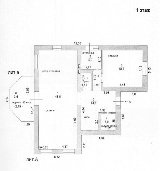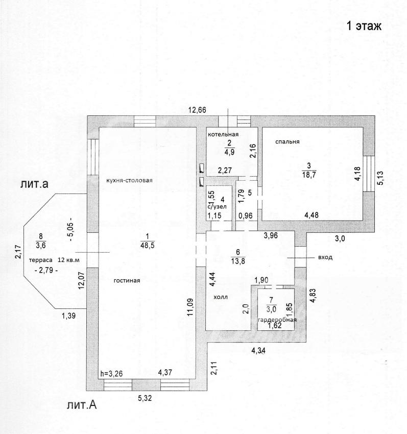 1-ый этаж: Холл 14 кв.м, гардеробная, коридор, спальня 18.7 кв.м, котельная 5 кв.м, санузел, гостиная с кухней-столовой 48.5 кв.м, терраса 12 кв.м.