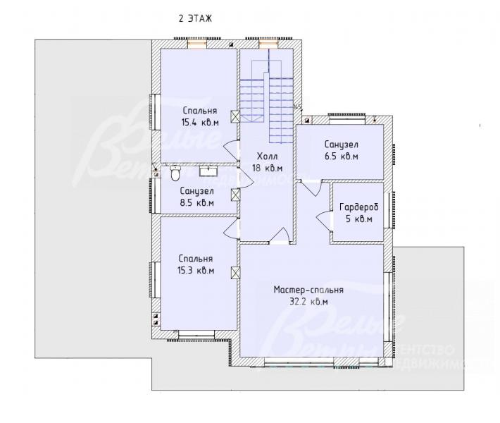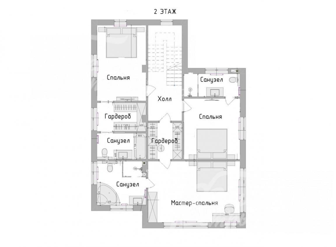 2-ой этаж: холл 14 кв.м, мастер-спальня 16 кв.м со своими гардеробной 6,1 кв.м и санузлом 5,5 кв.м, мастер-спальня 24,3 кв.м со своими гардеробной 5,5 кв.м и санузлом 9,3 кв.м, мастер-спальня 15 кв.м со своим санузлом 5,6 кв.м (есть альтернативная планировка - с двумя одинаковыми по размеру детскими спальнями и с одним общим для них санузлом).