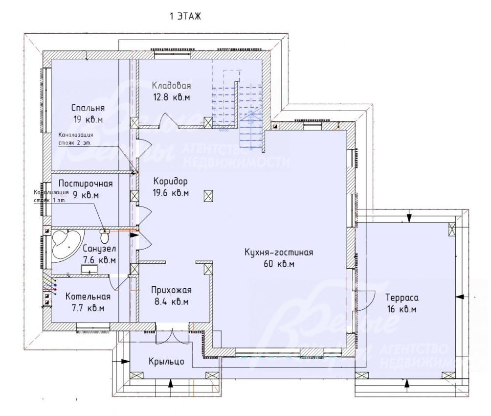1-ый этаж: крыльцо, холл, котельная, санузел, гардеробная, спальня, кладовая, кухня-столовая-гостиная, крытая терраса 32 кв.м.