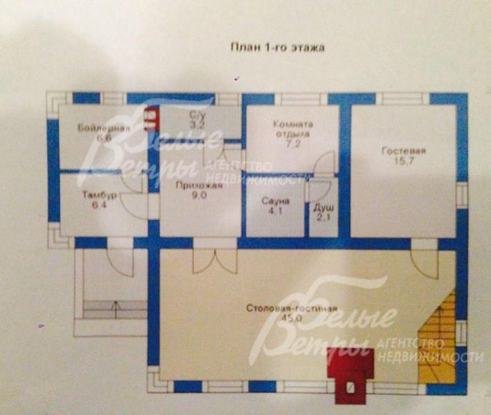 1-ый этаж: Крыльцо, тамбур 6.4 кв.м, бойлерная-котельная 6.6 кв.м, с/узел, холл-прихожая 9 кв.м, комната отдыха 7 кв.м, сауна, душевая, спальня 15.7 кв.м, столовая-гостиная 45 кв.м с камином.