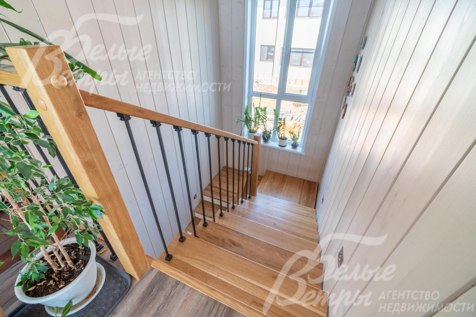 На второй этаж ведёт лестница с боковой подсветкой и ступенями, отделанными дубом