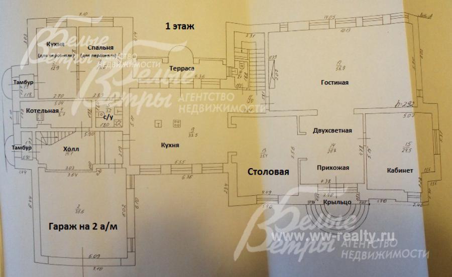 1-ый этаж: крыльцо 4 кв.м, холл-прихожая со вторым светом 21кв.м, кабинет 24.5 кв.м, гостиная с камином 57 кв.м, столовая 25 кв.м, кухня 33.5 кв.м с выходом на участок, холл 12 кв.м, с/узел; гараж на 2 а/м 36 кв.м, котельная 9 кв.м; крыло для персонала с отдельным входом: тамбур, кухня-столовая 13 кв.м, спальня 14 кв.м с с/узлом