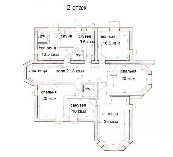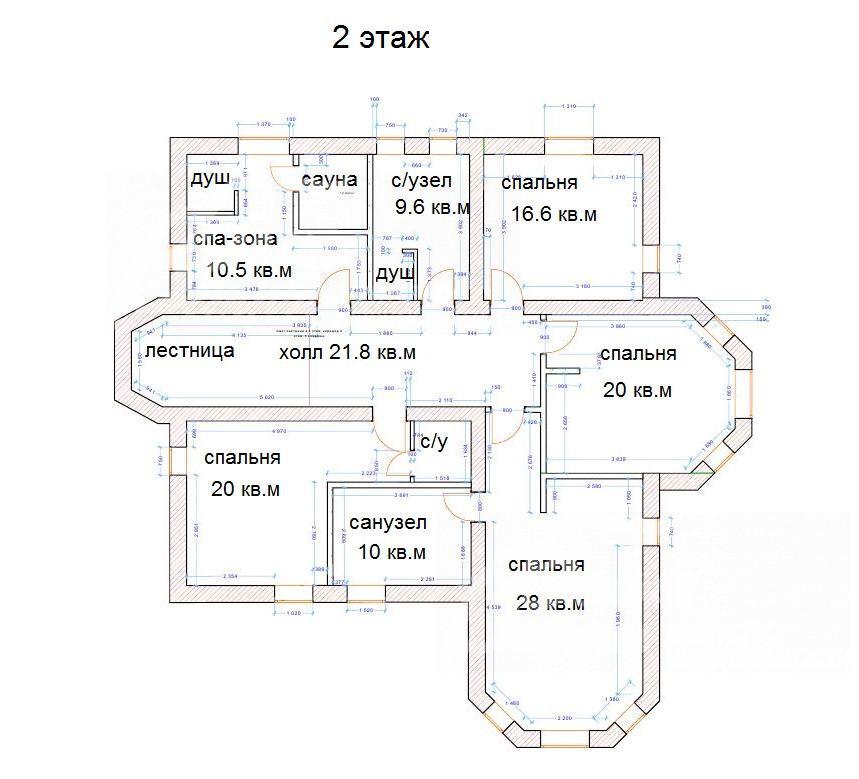 2-ой этаж: Холл 22 кв.м, 4 спальни (20 кв.м, 28 кв.м, 20 кв.м, 16.6 кв.м), санузел 10 кв.м, санузел, санузел 9.6 кв.м, спа-зона с сауной и душем 19.5 кв.м.