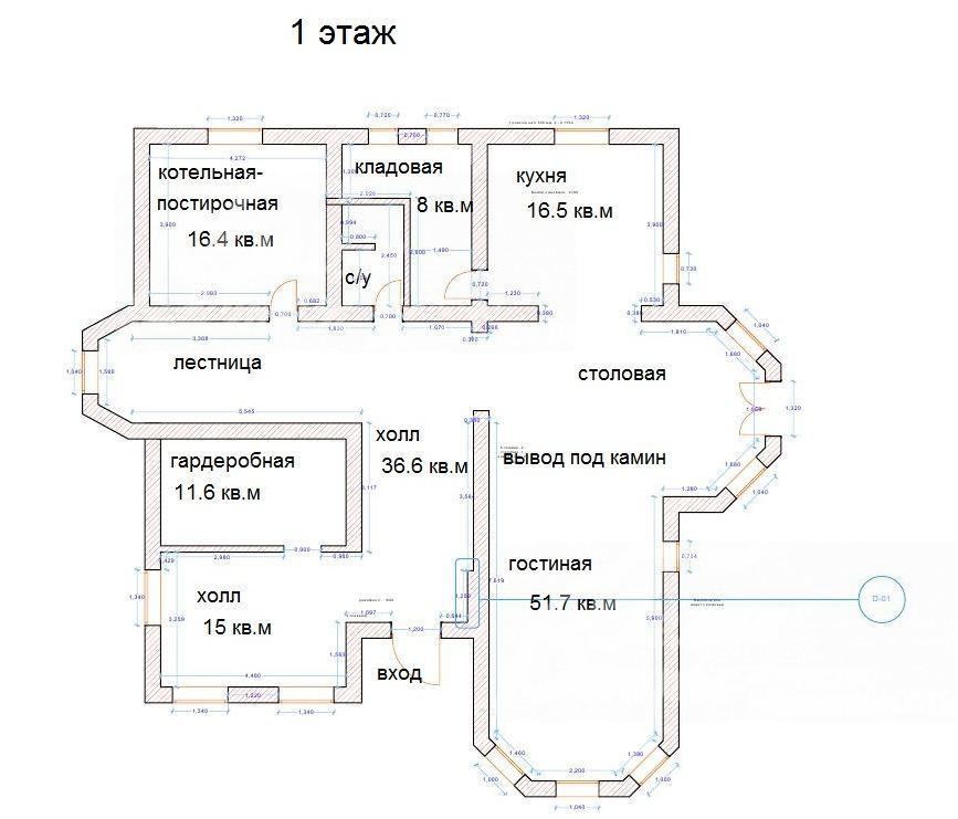 1-ый этаж: Тамбур, холл 36.6 кв.м, холл 15 кв.м, гардеробная 11.6 кв.м, котельная-постирочная 16.4 кв.м, лестница, кухня 16.5 кв.м, гостиная-столовая 51.7 кв.м, санузел 4 кв.м, кладовая 8 кв.м.