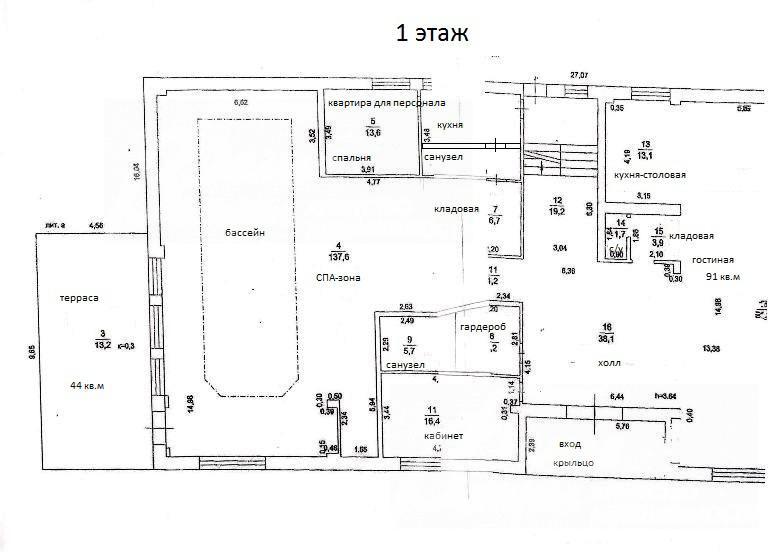 1-ый этаж: холл 38 кв.м, гардеробная 6 кв.м, с/узел 6 кв.м, гостиная 91 кв.м с камином, кухня-столовая 13 кв.м, кабинет 16 кв.м, гостевой с/узел; спа-зона с бассейном 137 кв.м с выходом на террасу 44 кв.м, квартира для персонала: спальня 13.6 кв.м, кухня, с/узел.
