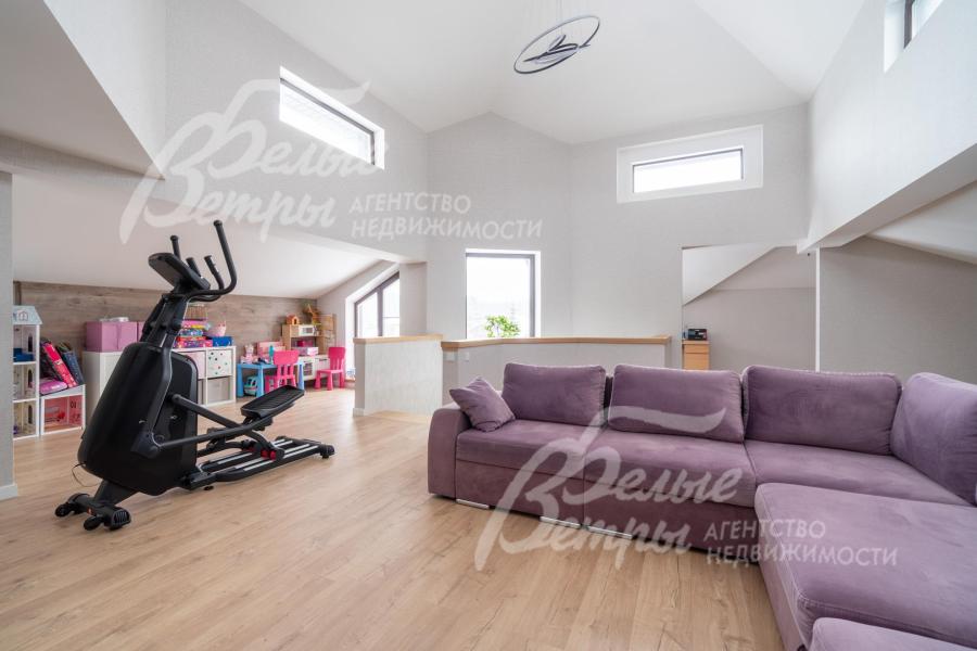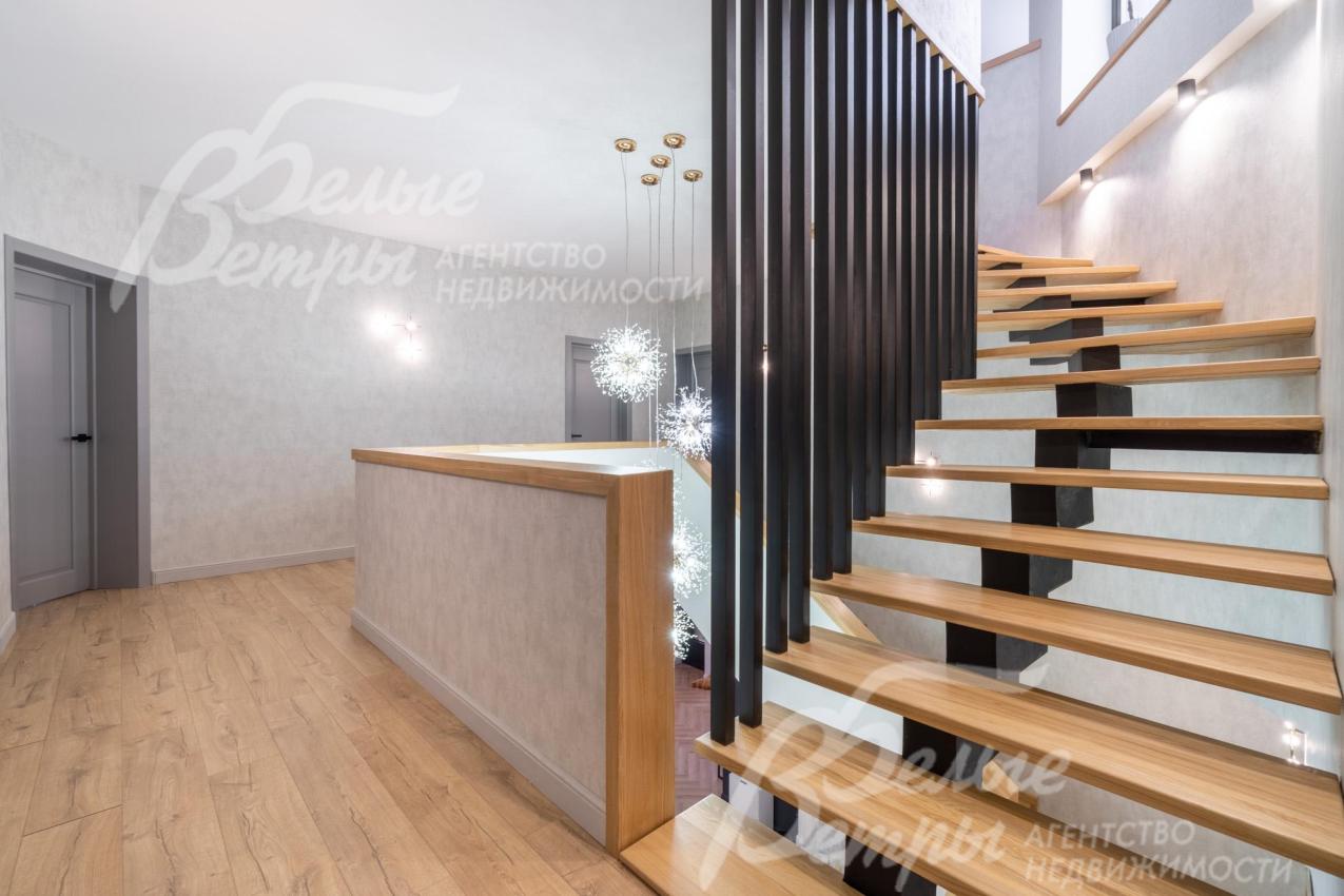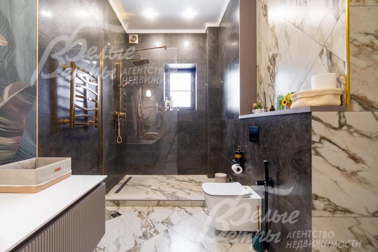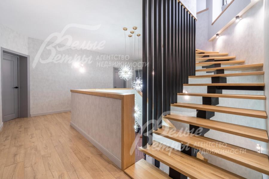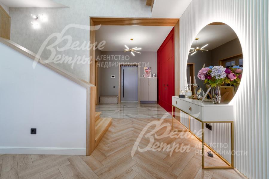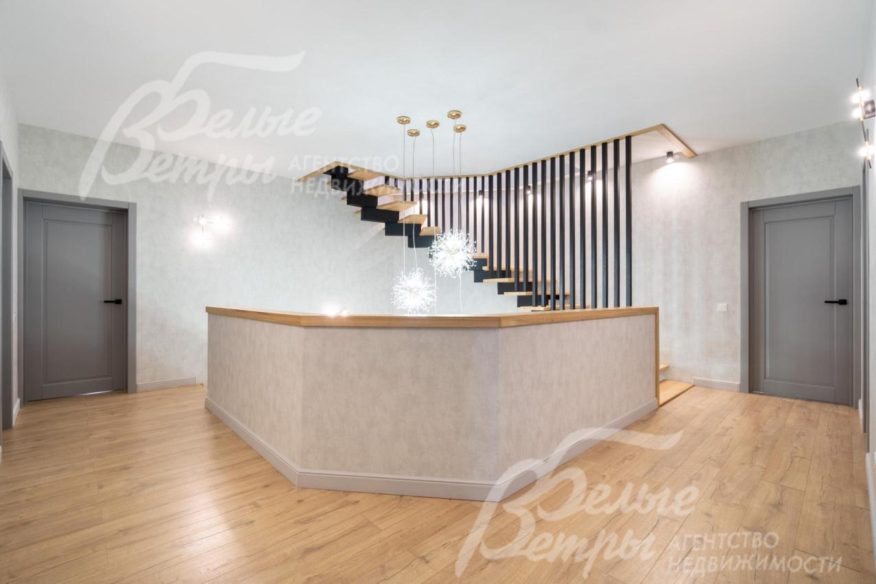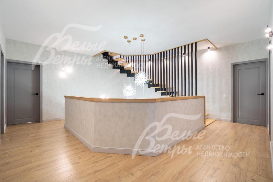 Описание внутренней отделки: качественная современная отделка дома выполнена в стиле эклектики с элементами ар-деко и лофта. Стены – обои, в отдельных зонах — частично на кухне, на лестничном проёме и в спальнях — немецкие обои с имитацией штукатурки, в детских спальнях стены оформлены под кирпич, в мастер-спальне и санузле на первом этаже стены украшены фресками Affresco (в санузле - со специальной влагозащитной эмалью). Стена в гостиной за телевизором - из гипсовых панелей. Холл и гостиная дополнены декоративными рейками из ясеня, перекликающимися с дизайном лестницы, а также 3D-панелями ORAC DECOR с рейками из ясеня. Создан декоративный портал, имитирующий камин. На полу кухни уложен керамогранит Laparet Stubay Onyx Crema имитирующий оникс, в гостиной и спальнях — ламинат, во всех санузлах — керамогранит Atlas Concorde. Потолки выполнены из гипсокартона, в отдельных зонах – многоуровневые конструкции. Тёплые полы смонтированы везде, где есть плиточное покрытие. Установлены внутрипольные конвекторы Askon в гостиной, на кухне и в мастер-спальне, а также вертикальные радиаторы чёрного матового цвета Irsap (Италия). Электромонтаж выполнен с особым вниманием к удобству: количество розеток превышает стандартные требования, розетки и выключатели – чёрные, матовые, плоские. Интерьер дополняют межкомнатные двери из массива лиственницы, вандалоустойчивая двустворчатая дверь в кухню со стеклом при входе на кухню, также есть двери скрытого монтажа Инвизибл. Мощная входная дверь с терморазрывом. На второй этаж ведёт широкая и удобная монолитная лестница, отделанная массивом ясеня