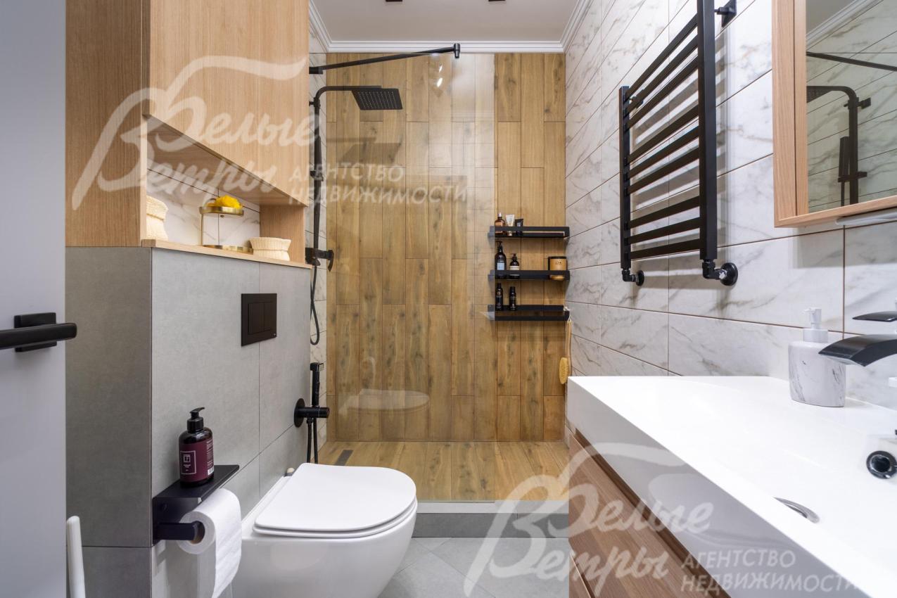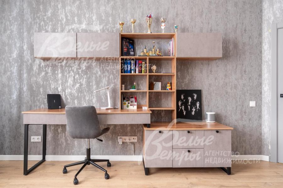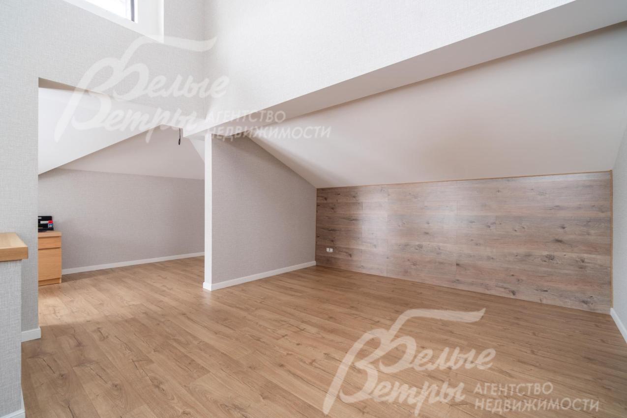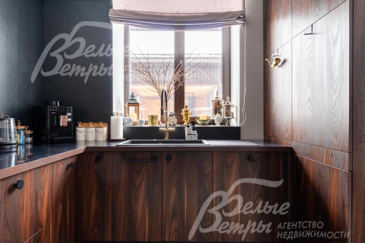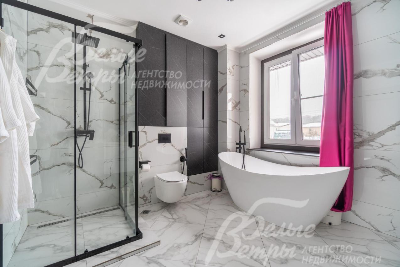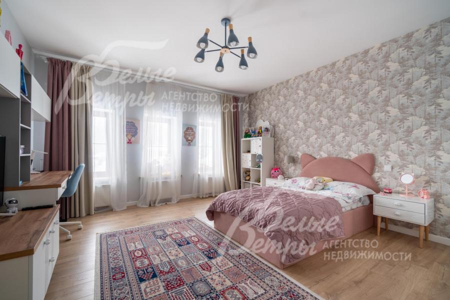 Описание внутренней отделки: качественная современная отделка дома выполнена в стиле эклектики с элементами ар-деко и лофта. Стены – обои, в отдельных зонах — частично на кухне, на лестничном проёме и в спальнях — немецкие обои с имитацией штукатурки, в детских спальнях стены оформлены под кирпич, в мастер-спальне и санузле на первом этаже стены украшены фресками Affresco (в санузле - со специальной влагозащитной эмалью). Стена в гостиной за телевизором - из гипсовых панелей. Холл и гостиная дополнены декоративными рейками из ясеня, перекликающимися с дизайном лестницы, а также 3D-панелями ORAC DECOR с рейками из ясеня. Создан декоративный портал, имитирующий камин. На полу кухни уложен керамогранит Laparet Stubay Onyx Crema имитирующий оникс, в гостиной и спальнях — ламинат, во всех санузлах — керамогранит Atlas Concorde. Потолки выполнены из гипсокартона, в отдельных зонах – многоуровневые конструкции. Тёплые полы смонтированы везде, где есть плиточное покрытие. Установлены внутрипольные конвекторы Askon в гостиной, на кухне и в мастер-спальне, а также вертикальные радиаторы чёрного матового цвета Irsap (Италия). Электромонтаж выполнен с особым вниманием к удобству: количество розеток превышает стандартные требования, розетки и выключатели – чёрные, матовые, плоские. Интерьер дополняют межкомнатные двери из массива лиственницы, вандалоустойчивая двустворчатая дверь в кухню со стеклом при входе на кухню, также есть двери скрытого монтажа Инвизибл. Мощная входная дверь с терморазрывом. На второй этаж ведёт широкая и удобная монолитная лестница, отделанная массивом ясеня