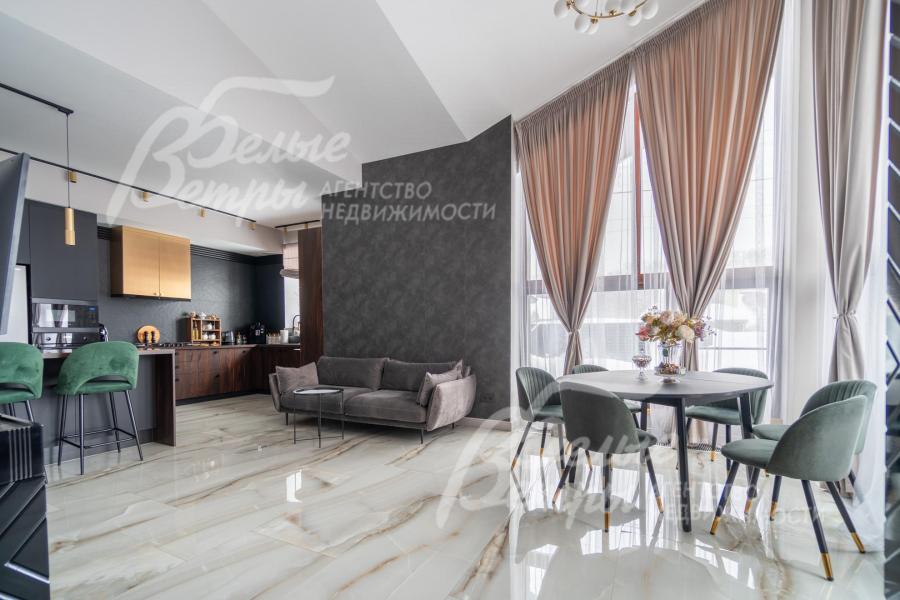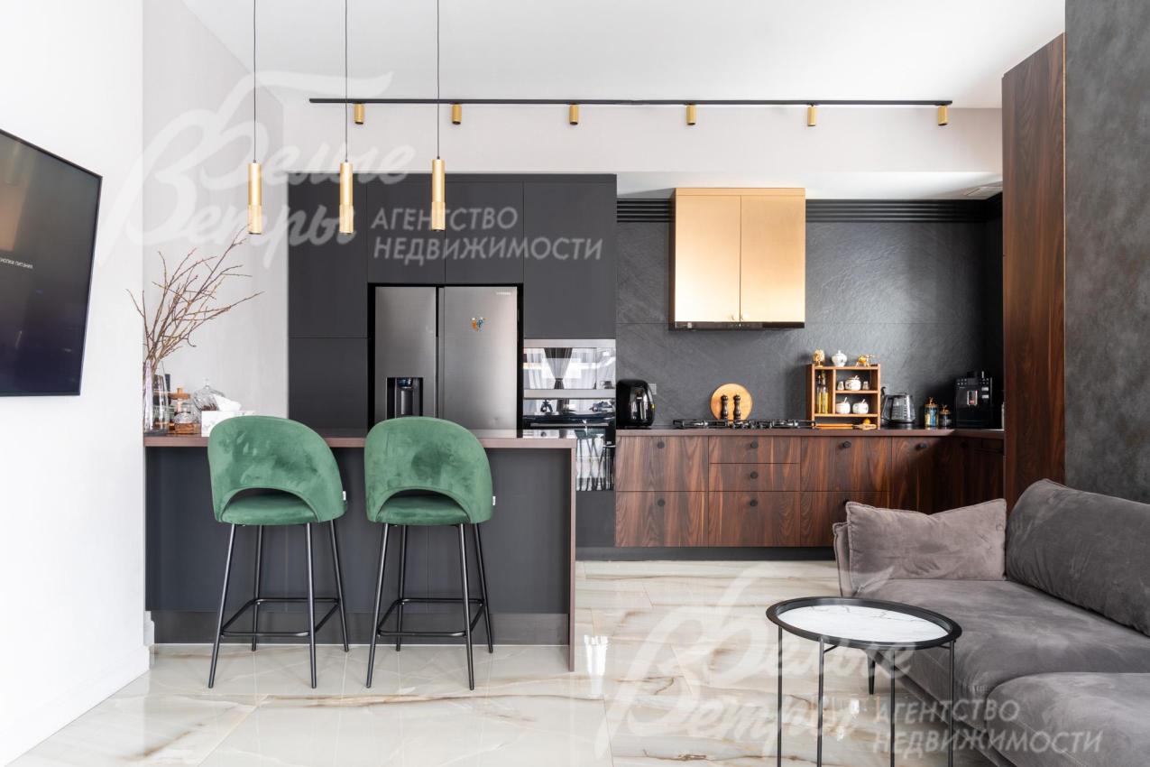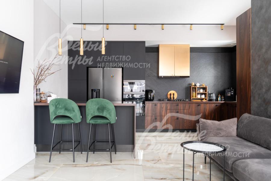 Мебель, оборудование: Кухня-столовая зонирована на 3 части: а) столовая с обеденным столом из сатинированного стекла "под мрамор", велюровые стульями - у панорамного окна. для семейных обедов; б) зона отдыха с диваном и телевизор LG 65 дюймов; в) кухонная зона с гарнитуром с комбинированными фасадами ("под акацию", матовые черные, золотистые) со всей необходимой встроенной техникой (газовая варочная панель на 5 конфорок, духовой шкаф AEG, микроволновая печь, двустворчатый холодильник с ледогенератором Samsung, второй холодильник встроенный Wiessgauff, посудомоечная машина Electrolux, вытяжка KUPPERSBERG). Также есть кухонный остров с полубарным столом и стульями, фартук из широкоформатного керамогранита "под черный сланец".