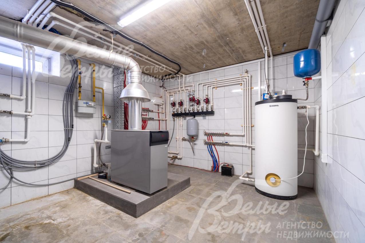 Инженерное обеспечение: система отопления представлена итальянским газовым котлом Baxi мощностью 63 кВт, горячее водоснабжение обеспечивается бойлером Kospel объёмом 200 л. Для воды предусмотрена многоступенчатая система очистки BWT. На кухне установлена вытяжка KUPPERSBERG, в санузлах – принудительная вентиляция. В гостиной и на кухне смонтированы два кондиционера Haier. Есть мастер-выключатель, много проходных выключателей света. Резервный генератор.