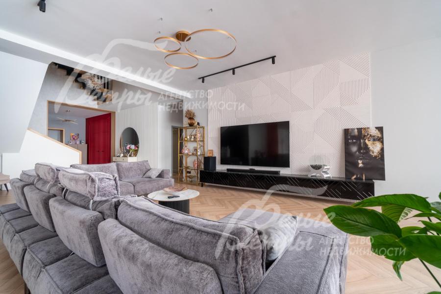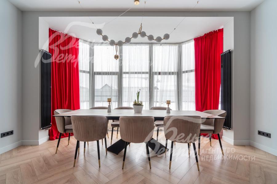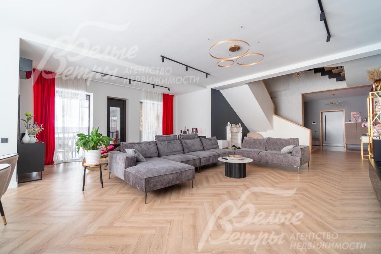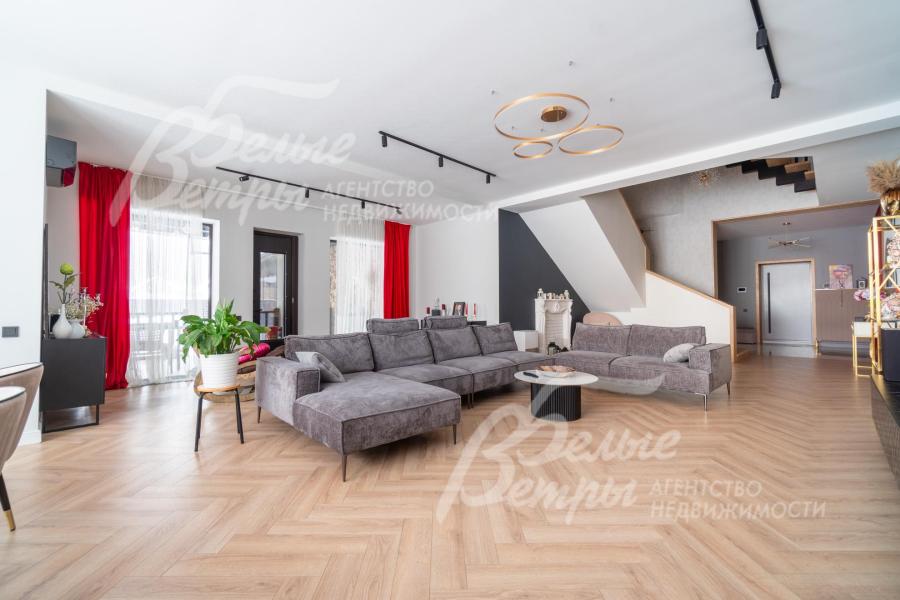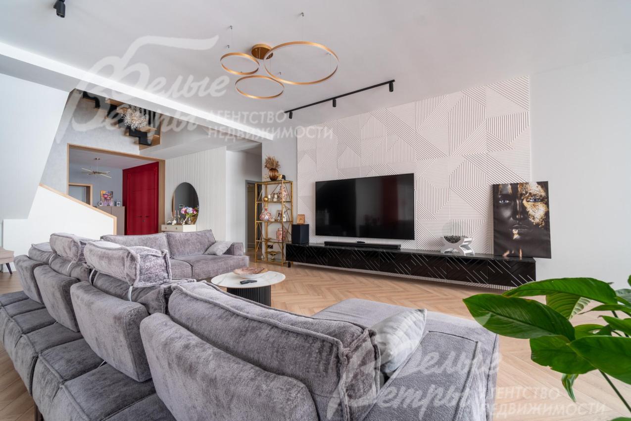 В гостиной – обеденная группа на 10-12 персон: элегантный стол с керамической столешницей, велюровые стулья, телевизор LG 85 дюймов с консолью под ТВ в стиле ар-деко, сделанной на заказ. В центре – огромный модульный диван-трансформер с обивкой из ткани букле. Интерьер гостиной дополнен дизайнерским стеллажом (Гарда Декор) в стиле ар-деко с гальваническим покрытием золотого цвета и полками из закаленного стекла, круглым зеркалом с консолью, комодами тёмного цвета, люстрой из латуни «Бусы Коко Шанель». Дополнительно выполнено трековое освещение. В постирочной – стиральная и сушильная машины AEG, гладильные принадлежности, модульные шкафы для хранения. В гардеробной на первом этаже – система хранения (ИКЕА). Все спальни полностью укомплектованы дорогостоящей мебелью: кроватями, прикроватными тумбами, комодами, телевизорами LG, шкафами, рабочими зонами. На мансардном этаже – модульный диван, обшитый антивандальным покрытием, и телевизор SONY. Шторы сшиты на заказ. В санузлах – водяные полотенцесушители Grocenberg, унитазы NOVA, гигиенический душ (в каждом санузле), оборудованы душевые, на первом этаже - смесители Boheme, на втором этаже - ванна и чёрная матовая фурнитура GRONENBERG и TECE