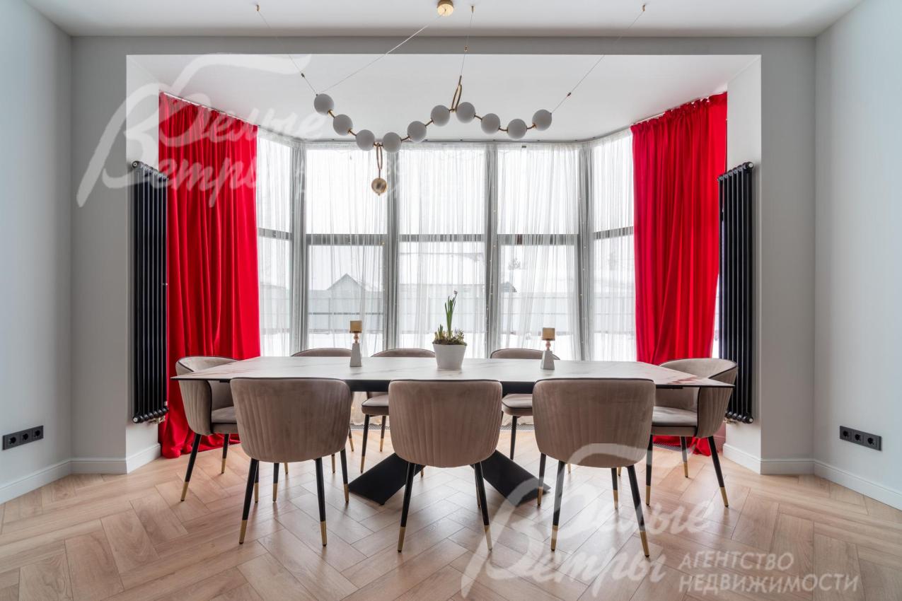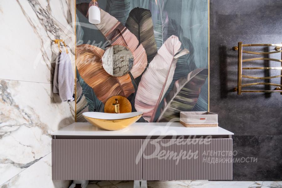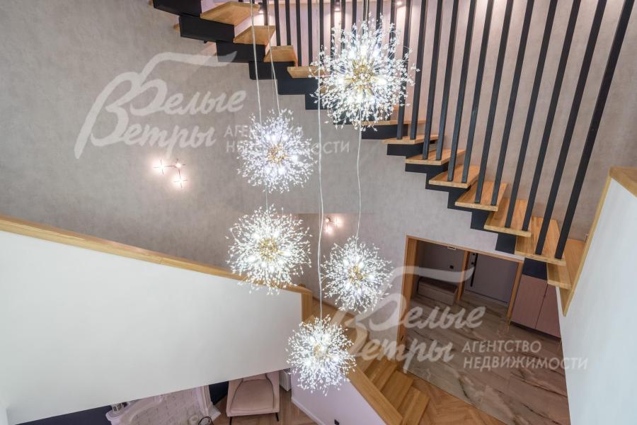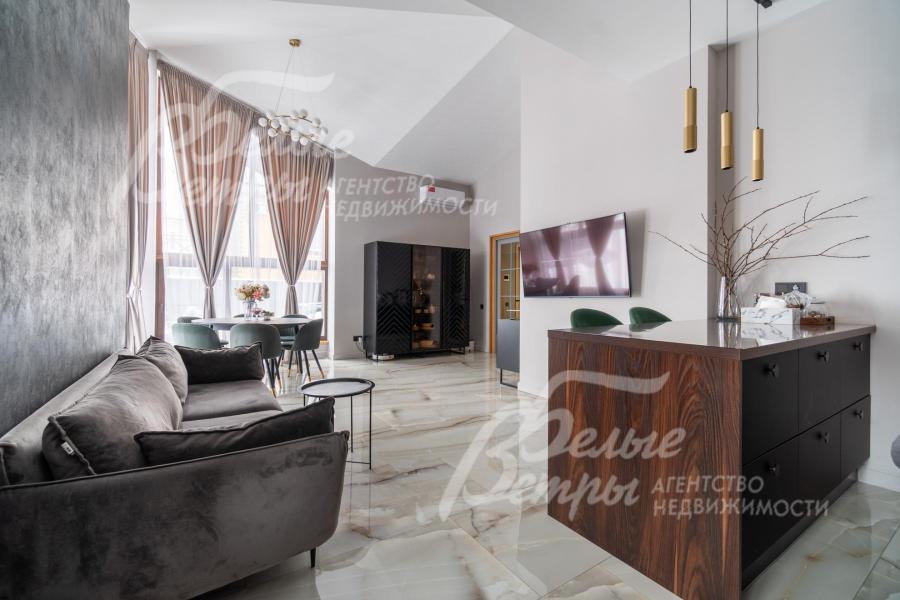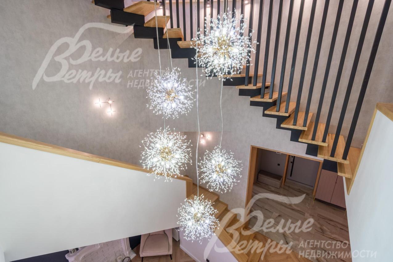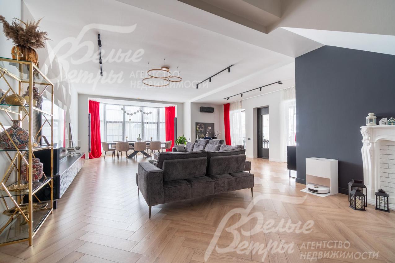 В гостиной – обеденная группа на 10-12 персон: элегантный стол с керамической столешницей, велюровые стулья, телевизор LG 85 дюймов с консолью под ТВ в стиле ар-деко, сделанной на заказ. В центре – огромный модульный диван-трансформер с обивкой из ткани букле. Интерьер гостиной дополнен дизайнерским стеллажом (Гарда Декор) в стиле ар-деко с гальваническим покрытием золотого цвета и полками из закаленного стекла, круглым зеркалом с консолью, комодами тёмного цвета, люстрой из латуни «Бусы Коко Шанель». Дополнительно выполнено трековое освещение. В постирочной – стиральная и сушильная машины AEG, гладильные принадлежности, модульные шкафы для хранения. В гардеробной на первом этаже – система хранения (ИКЕА). Все спальни полностью укомплектованы дорогостоящей мебелью: кроватями, прикроватными тумбами, комодами, телевизорами LG, шкафами, рабочими зонами. На мансардном этаже – модульный диван, обшитый антивандальным покрытием, и телевизор SONY. Шторы сшиты на заказ. В санузлах – водяные полотенцесушители Grocenberg, унитазы NOVA, гигиенический душ (в каждом санузле), оборудованы душевые, на первом этаже - смесители Boheme, на втором этаже - ванна и чёрная матовая фурнитура GRONENBERG и TECE