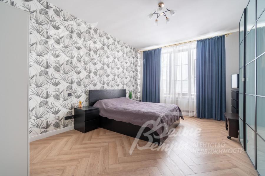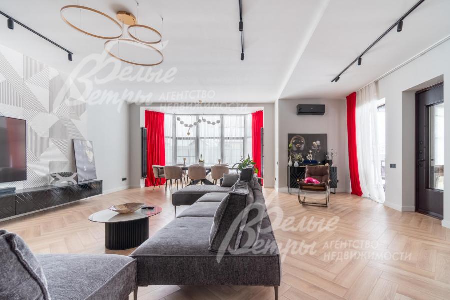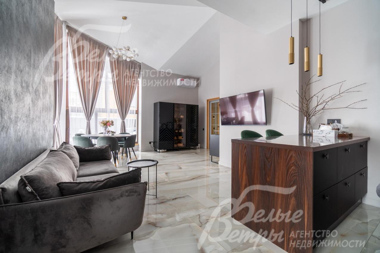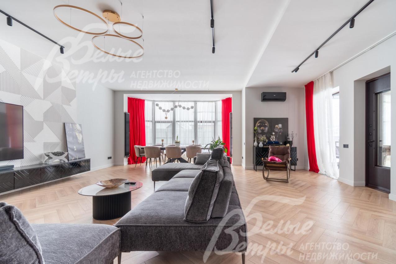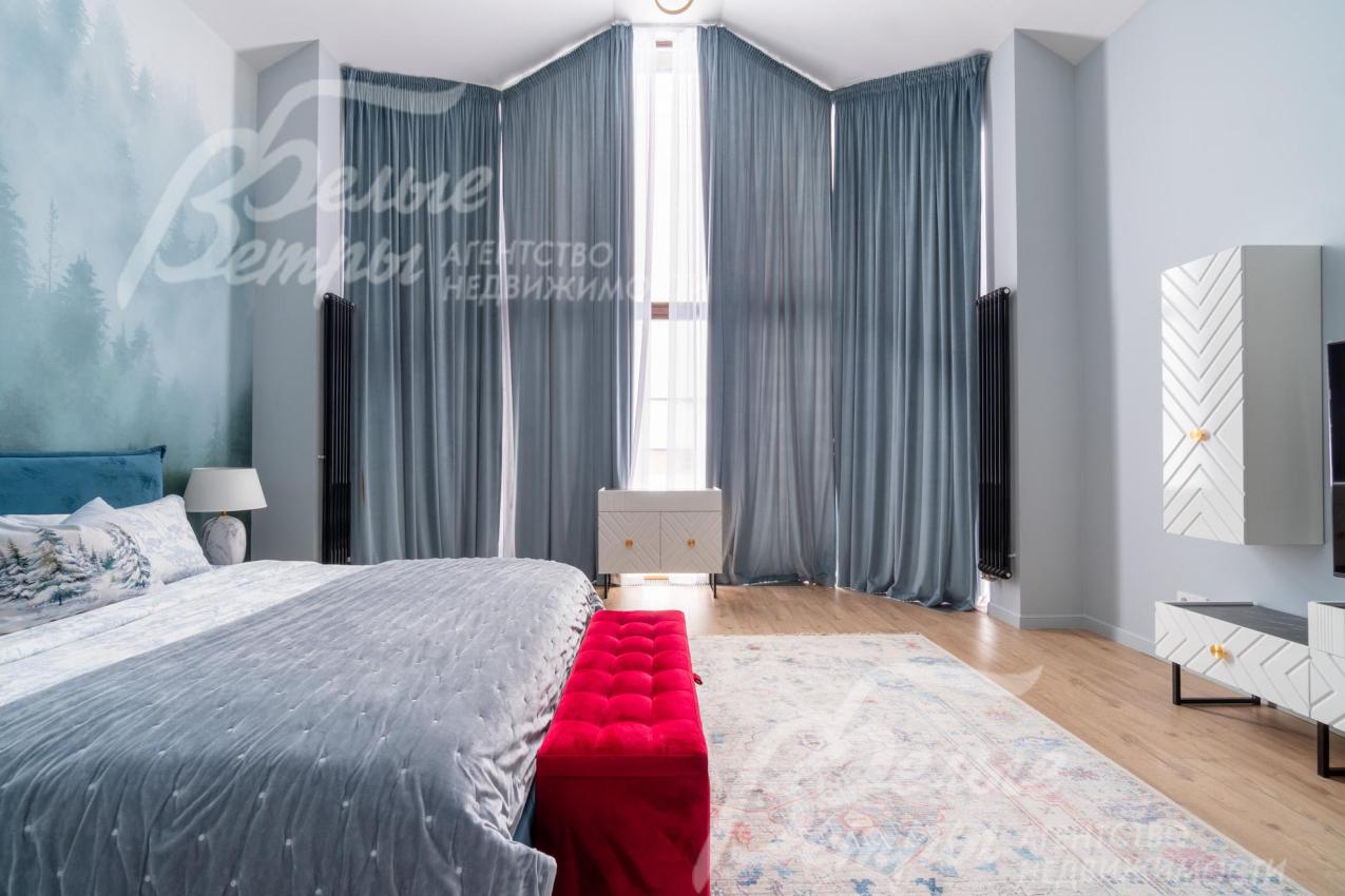 В гостиной – обеденная группа на 10-12 персон: элегантный стол с керамической столешницей, велюровые стулья, телевизор LG 85 дюймов с консолью под ТВ в стиле ар-деко, сделанной на заказ. В центре – огромный модульный диван-трансформер с обивкой из ткани букле. Интерьер гостиной дополнен дизайнерским стеллажом (Гарда Декор) в стиле ар-деко с гальваническим покрытием золотого цвета и полками из закаленного стекла, круглым зеркалом с консолью, комодами тёмного цвета, люстрой из латуни «Бусы Коко Шанель». Дополнительно выполнено трековое освещение. В постирочной – стиральная и сушильная машины AEG, гладильные принадлежности, модульные шкафы для хранения. В гардеробной на первом этаже – система хранения (ИКЕА). Все спальни полностью укомплектованы дорогостоящей мебелью: кроватями, прикроватными тумбами, комодами, телевизорами LG, шкафами, рабочими зонами. На мансардном этаже – модульный диван, обшитый антивандальным покрытием, и телевизор SONY. Шторы сшиты на заказ. В санузлах – водяные полотенцесушители Grocenberg, унитазы NOVA, гигиенический душ (в каждом санузле), оборудованы душевые, на первом этаже - смесители Boheme, на втором этаже - ванна и чёрная матовая фурнитура GRONENBERG и TECE