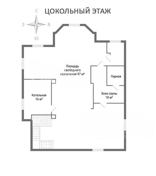 Цоколь: котельная 16 кв.м, зона сауны с комнатой отдыха, помещение свободного назначения 97 кв.м