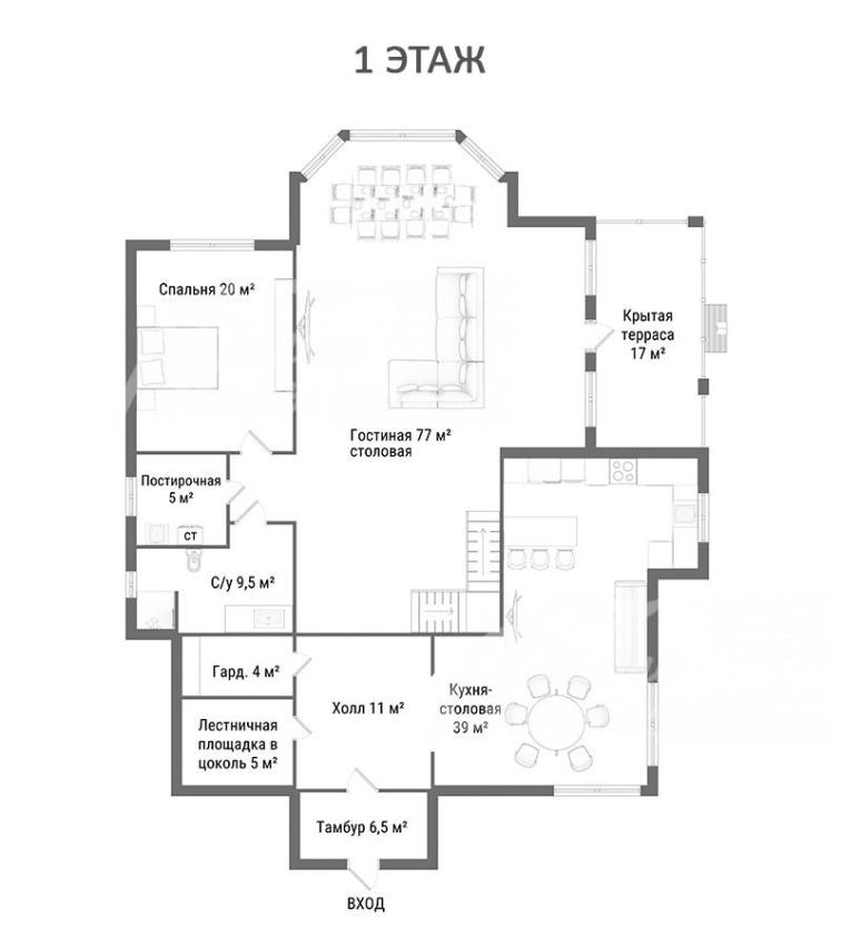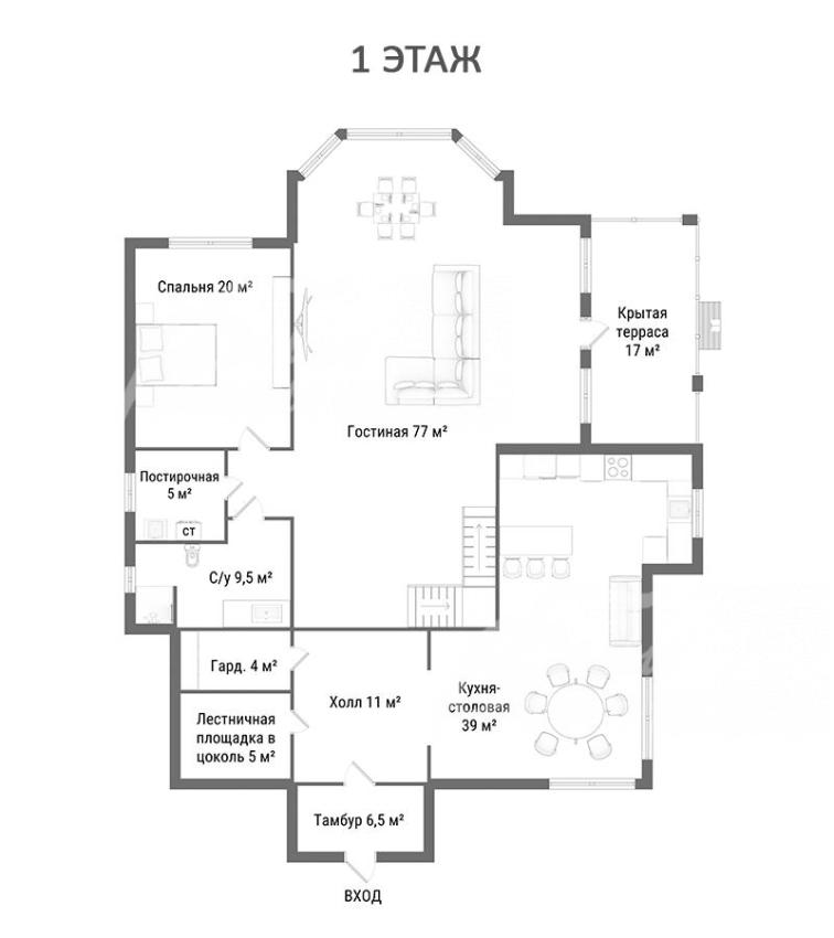 1-ый этаж: тамбур 6,5 кв.м, холл 11 кв.м, гардеробная 4 кв.м, кухня-столовая 39 кв.м, гостиная 77 кв.м с выходом на крытую террасу 17 кв.м, санузел 9,5 кв.м, спальня 20 кв.м, постирочная 5 кв.м