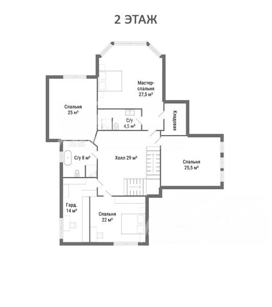 2-ой этаж: холл 29 кв.м, мастер-спальня 27,5 кв.м с санузлом 4,5 кв.м (с душевой) и кладовой, спальня 25 кв.м, спальня 25,5 кв.м, спальня 22 кв.м, гардеробная 14 кв.м, санузел 8 кв.м (с душевой и отдельностоящей ванной)