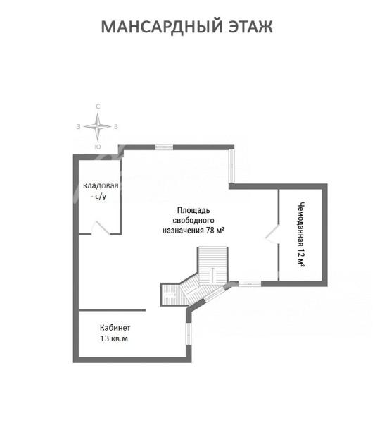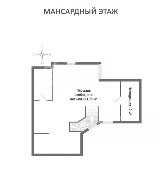 3-ий этаж: мансардный этаж: площадь свободного назначения 78 кв.м, кабинет 12кв.м, чемоданная 12 кв.м