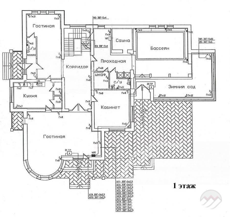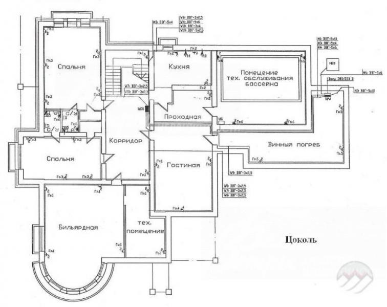 Цоколь: бойлерная, техническое помещение, помещения для обслуживания бассейна, хозяйственное помещение, холл, тренажерный зал 42 кв.м, с/узел, душевая; винное хранилище, бильярдный зал с баром 60 кв.м