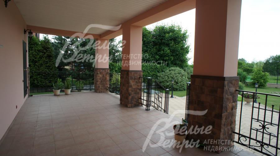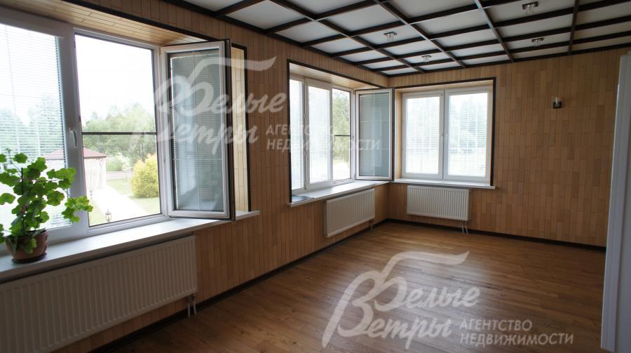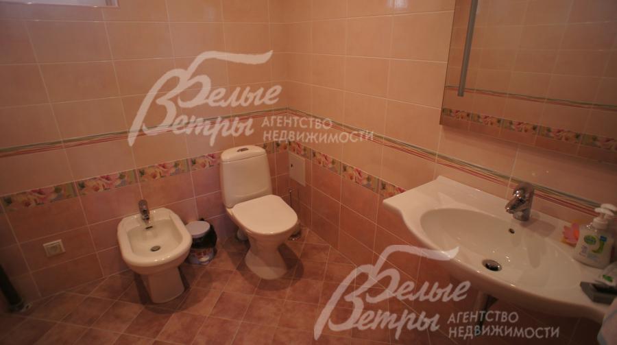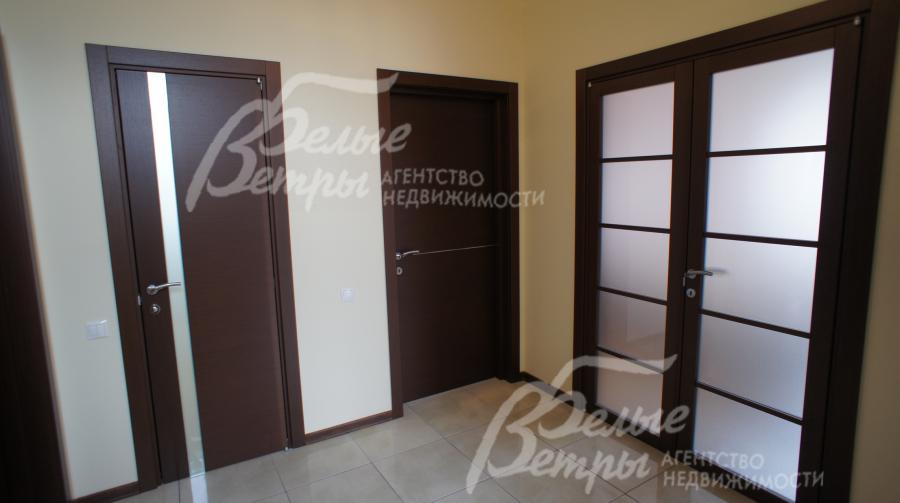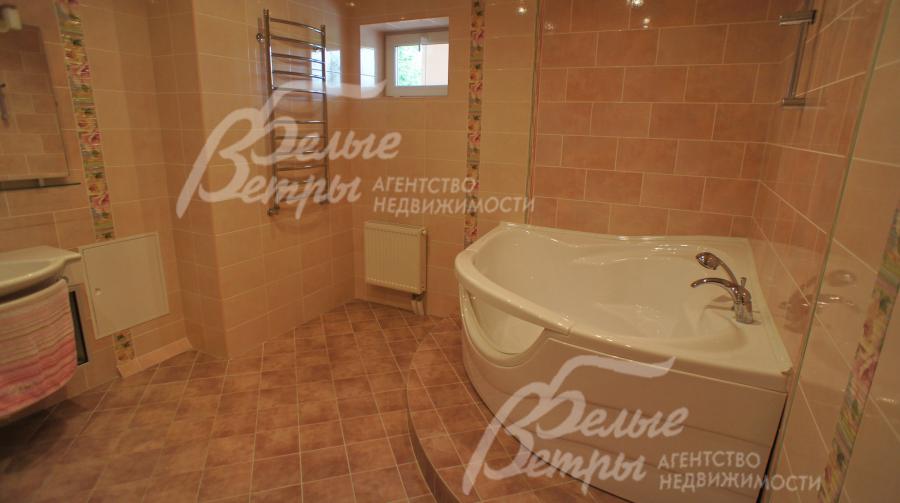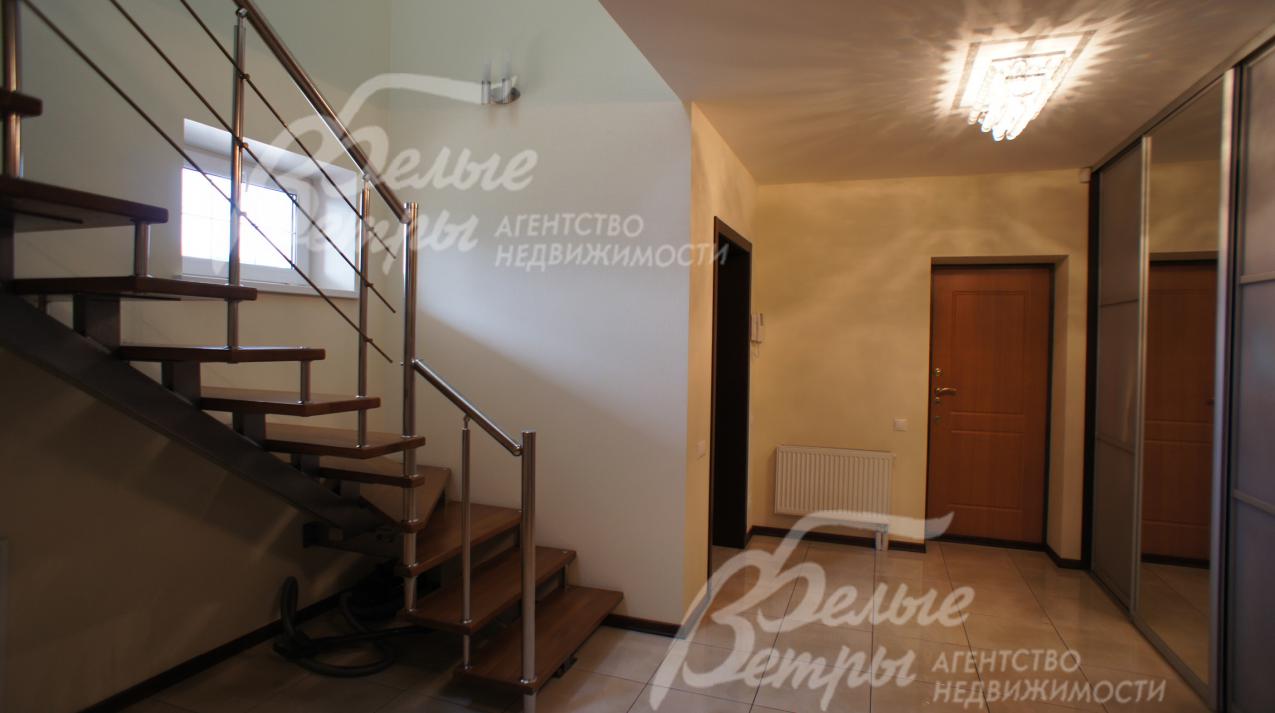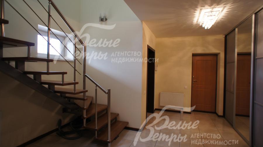 Описание внутренней отделки: Отделка высокого качества в классическом стиле. Стены окрашены, оклеены обоями под покраску, в санузлах плитка, в столовой стены отделаны массивом натурального дерева. В холле, санузлах и кухне пол покрыт кафельной плиткой с водяным подогревом, в спальнях, гостиной и столовой паркетом из натурального дуба. Лестница поворотная на больцах легкая, ступени дубовые, перила металлические. Потолки подвесные ГКЛ многоуровневые со скрытой подсветкой, в столовой с деревянной раскладкой. Двери деревянные шпонированные. Все коммуникации разведены под ключ. Радиаторы стальные " Kermi". Вся сантехника бренда " Laufen".