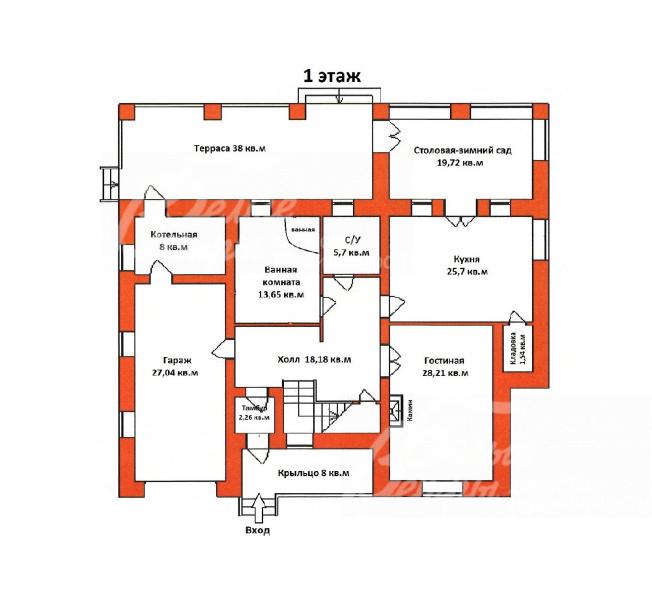 1-ый этаж: Крыльцо 8 кв.м, тамбур, холл 18 кв.м, гостиная 28 кв.м, кухня 26 кв.м с кладовой, столовая - зимний сад 20 кв.м с выходом на террасу 38 кв.м, с/узел 14 кв.м с ванной, с/узел 6 кв.м, гараж 27 кв.м, котельная 8 кв.м с отдельным выходом на улицу.