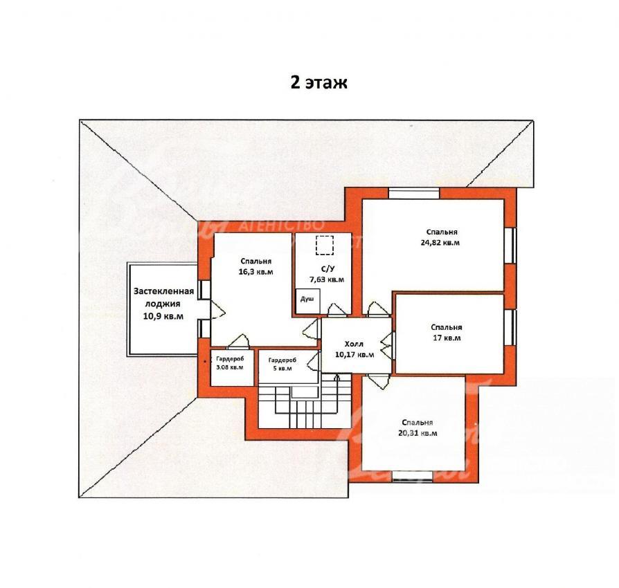 2-ой этаж: Холл 10 кв.м, спальня 20 кв.м, спальня 17 кв.м, спальня 25 кв.м, спальня 16 кв.м с гардеробной и с выходом на застекленную лоджию 11 кв.м, с/узел 8 кв.м, гардеробная 5 кв.м.