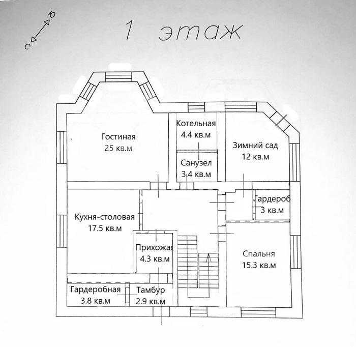 1-ый этаж: тамбур 2.9 кв.м, гардеробная 3.8 кв.м, прихожая 4.3 кв.м, лестничный холл 9.3 кв.м, кухня-столовая 17.5 кв. м, гостиная 25 кв.м, коридор 2.5 кв.м, гардеробная 3 кв.м, комната отдыха с выходом во двор 12 кв.м, спальня 15.3 кв.м, санузел 3.4 кв.м, котельная 4.4 кв.м.