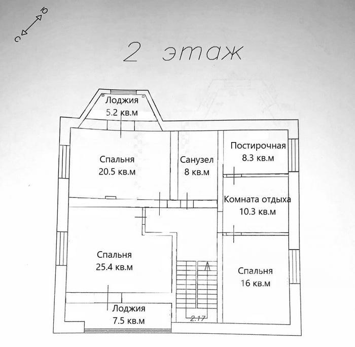 2-ой этаж: лестничный холл 8 кв.м, спальня 25.4 кв.м с выходом на застекленную лоджию 7.5 кв.м, спальня 20.5 кв.м, с выходом на застекленную лоджию 5.2 кв.м, спальня 16 кв.м, комната отдыха 10.3 кв.м, постирочная 8.3 кв.м, ванная комната 8 кв.м.