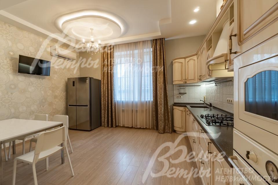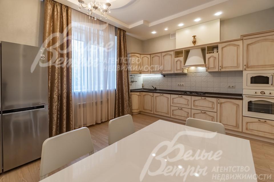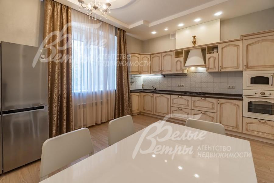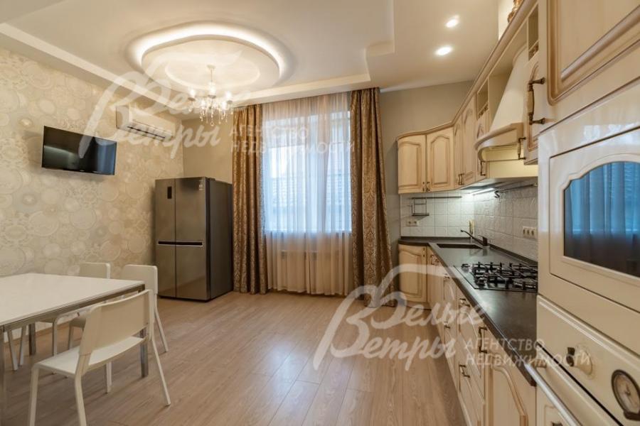 Мебель, оборудование: установлен кухонный гарнитур Мария молочного цвета со встроенной техникой: микроволновая печь, духовой шкаф, газовая плита Gorenje, посудомоечная машина AEG (немецкая), двустворчатый холодильник LG.