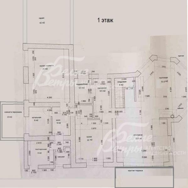 1-ый этаж: прихожая 9.5 кв.м, холл 9 кв.м, гардеробная 5.5 кв.м, кладовая, кухня 22 кв.м, с/у 3 кв.м, котельная 8 кв.м, гостиная 33.5 кв.м с выходом на патио, столовая 33.5 кв.м, жилая комната 25.4 кв.м, комната персонала 13 кв.м, к дому пристроен гараж на 1 авто