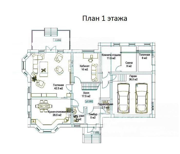 1-ый этаж: крыльцо, гараж на 2 авто 37 кв.м, тамбур 5 кв.м, холл 18 кв.м, гостиная 43 кв.м, кухня-столовая 27 кв.м, спальня/кабинет 18 кв.м, гардеробная 3 кв.м, санузел 4 кв.м, сауна 9 кв.м с комнатой отдыха 9 кв.м, санузел 3 кв.м, топочная 8 кв.м