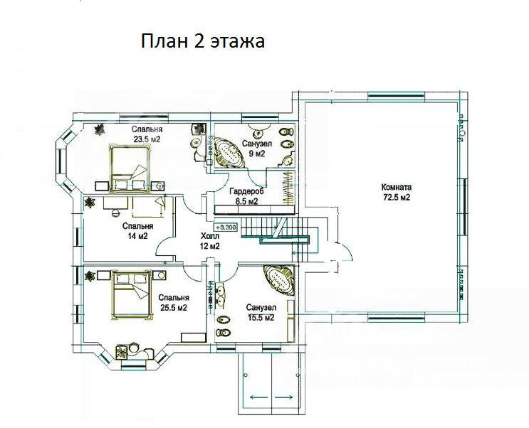 2-ой этаж: Главная спальня 24 кв.м с гардеробной 9 кв.м и санузлом 9 кв.м, спальня 26 кв.м, кабинет/спальня 14 кв.м, игровая комната / бильярдная 73 кв.м, санузел 16 кв.м