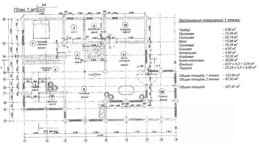 1-ый этаж: тамбур, прихожая 13 кв.м, холл 13 кв.м, гостиная 22 кв.м, гостевая спальня 16 кв.м, с/узел 5 кв.м, кухня — столовая 26.7 кв.м с выходом на террасу 7 кв.м, котельная 5 кв.м, кладовая 10 кв.м