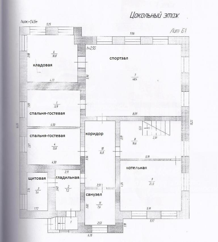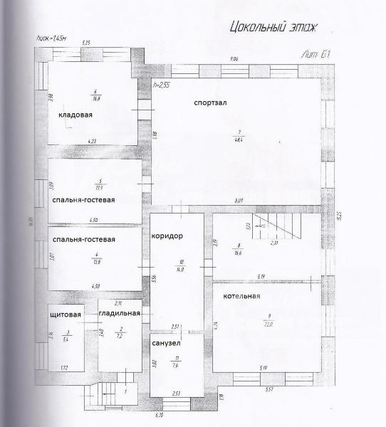 Цоколь: Холл 16.6 кв.м, коридор 14 кв.м, с/узел 7.6 кв.м, спальня 14 кв.м, спальня 14 кв.м, гладильная 7 кв.м, электрощитовая 5.4 кв.м, спортзал 48.4 кв.м, кладовая-кабинет 17 кв.м, котельная 22 кв.м.