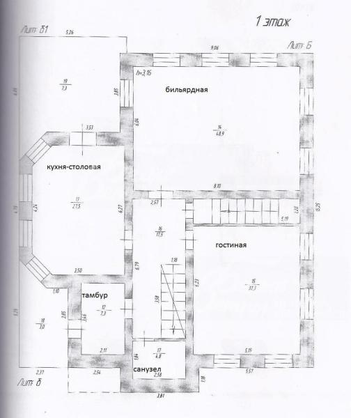 1-ый этаж: Крыльцо 10 кв.м, прихожая 7 кв.м, холл 17.5 кв.м, гостиная 32 кв.м, кухня-столовая 27.5 кв.м с выходом на террасу 24.5 кв.м, бильярдная 49 кв.м, с/узел 5 кв.м.