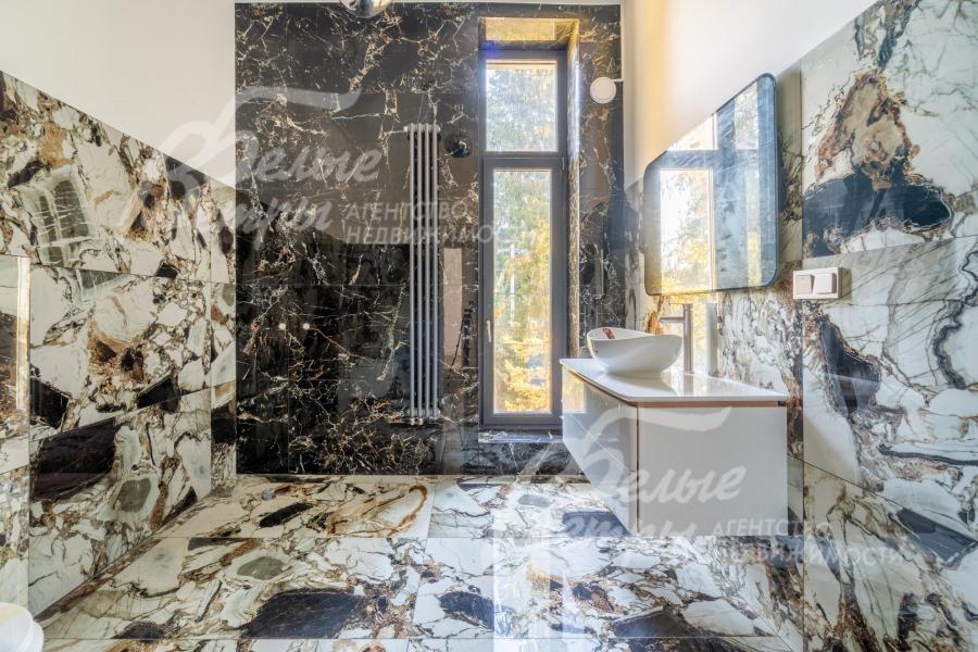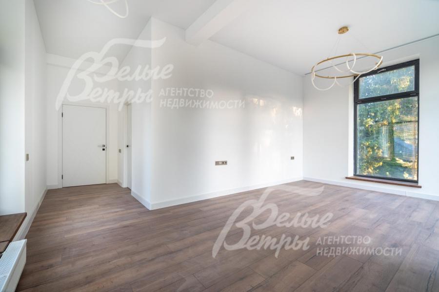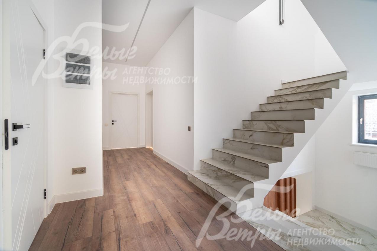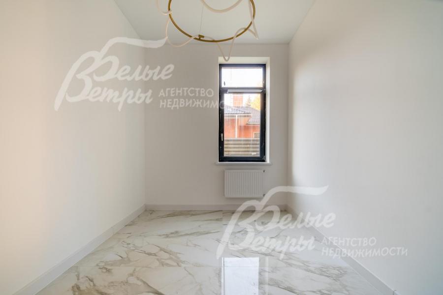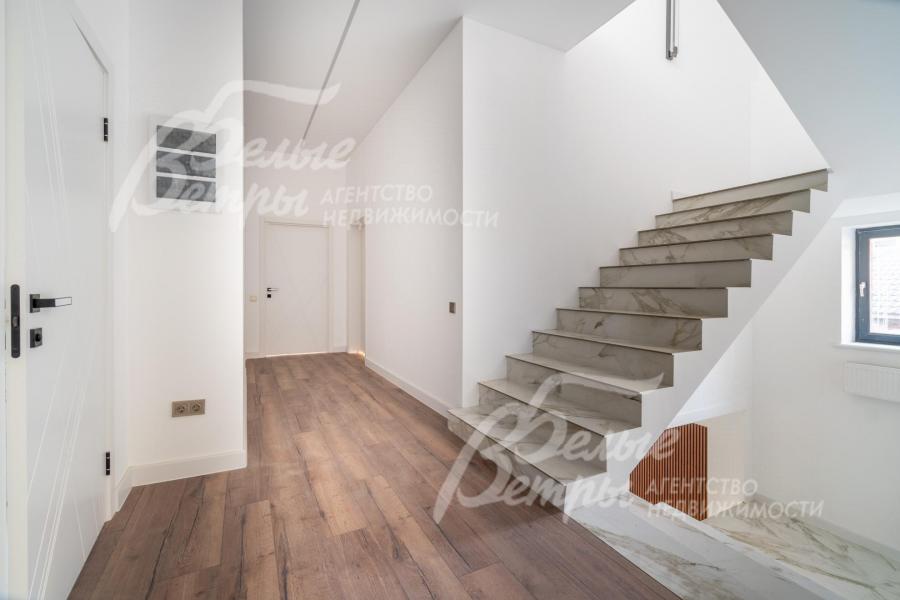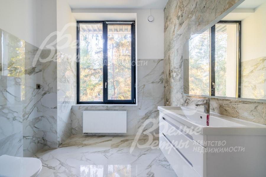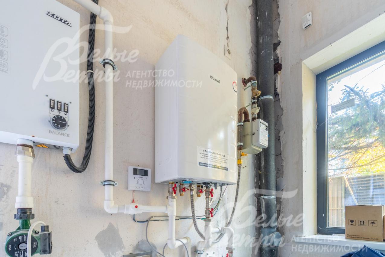 Описание внутренней отделки: стены окрашены, на полу керамогранит в общих помещениях и с/у, ламинат в спальнях и холле 2 этажа. Лестница бетонная широкая, ступени отделаны керамогранитом. Натяжные потолки. Все коммуникации разведены, теплые полы на 1 этаже, радиаторы стальные везде, внутрипольные конвекторы на 1 этаже. Сантехника установлена.