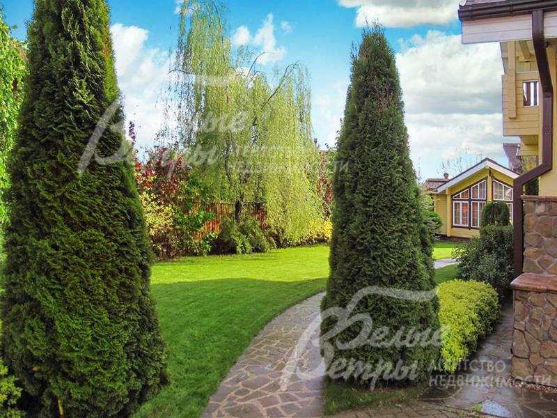 Благоустройство участка: великолепный ландшафтный дизайн, высажены взрослые хвойные деревья и кустарники, проложены дорожки и уличное освещение, ротонды. Есть открытая парковка на 4 а/м