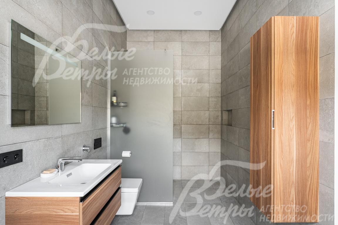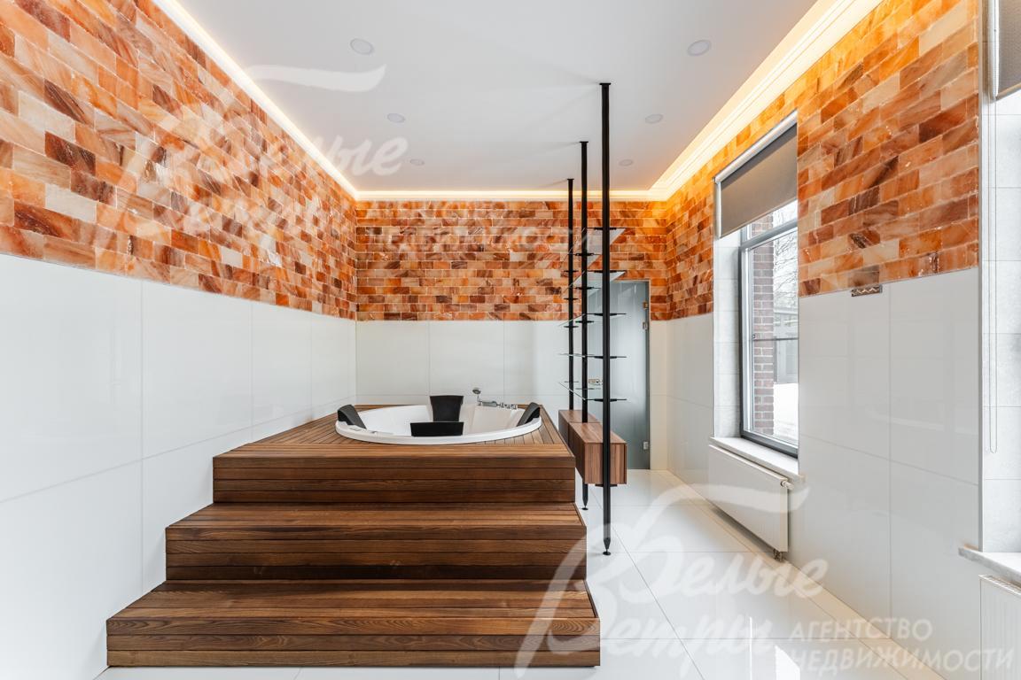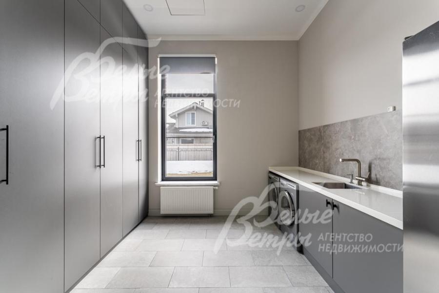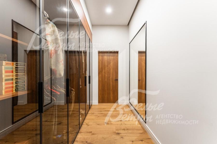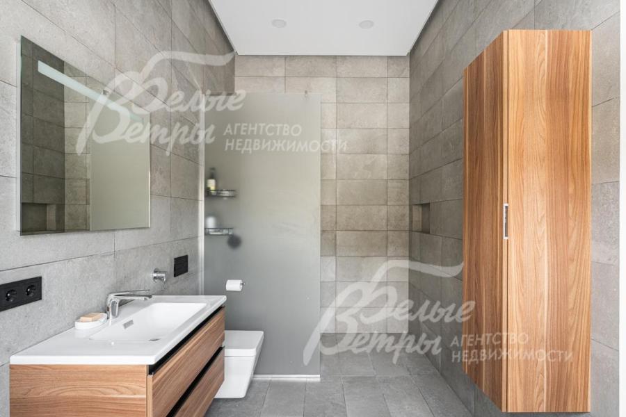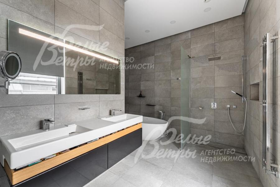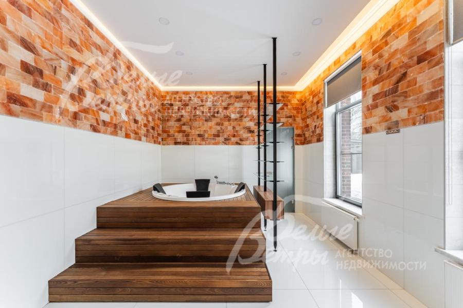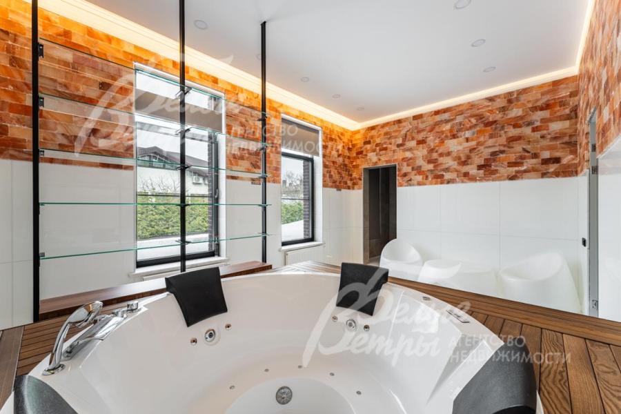 Описание внутренней отделки: индивидуальный авторский проект. Выполнена дизайнерская отделка: основные элементы отделки внутренних стен - покраска или декоративная штукатурка, в ванных комнатах - плитка из Италии, также Kerama-Marazzi. На полу керамогранит с водяным подогревом (Италия), массивная доска из американского ореха и ясеня. Многоуровневые потолки. Установлена сантехника бренда Jacob Delafon (Франция). Разводка коммуникаций по дому под ключ, розетки и выключатели фирмы Jung. Межкомнатные двери скрытого монтажа (без наличников, сливающиеся со стеной) высотой 240 см, к каждой двери итальянские ручки. Подоконники из искусственного камня (под белый мрамор).