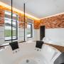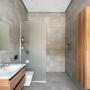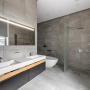 1-ый этаж: крыльцо 16 кв.м, прихожая с панорамным остеклением 28 кв.м, гостевой санузел 5 кв.м, кухня 11 кв.м, гостиная-столовая 115 кв.м с панорамным остеклением, зенитными окнами и выходом в зимний сад 47 кв.м, коридор 17 кв.м, кабинет 27 кв.м, котельная-постирочная 17 кв.м. Дом поделён на два блока (мастер-блок и детский блок): мастер-блок общей площадью 70 кв.м включает в себя: гардеробная 24 кв.м, мастер-спальня 29 кв.м с отдельным выходом в зимний сад, ванная комната 15 кв.м; детский блок: коридор 29 кв.м, спальня-1 26 кв.м, с собственным санузлом 7 кв.м, спальня-2 23 кв.м с отдельным санузлом 7 кв.м, спальня-3 с отдельным санузлом 9 кв.м и выходом в зимний сад.