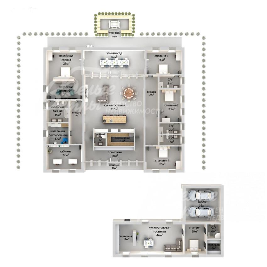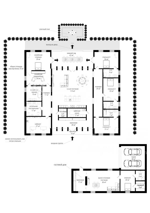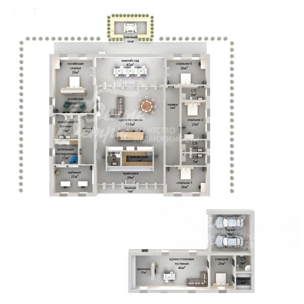Дополнительные строения: - Вспомогательный (гостевой) дом площадью 150 кв.м: гараж на два авто 38 кв.м, прихожая 17 кв.м, кухня-столовая-гостиная 46 кв.м, спальня 20 кв.м, санузел 6 кв.м, гардероб 6 кв.м;