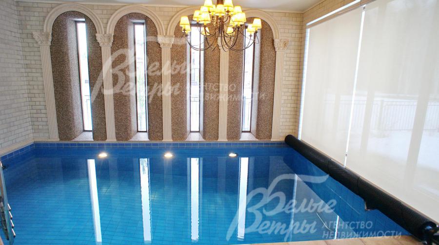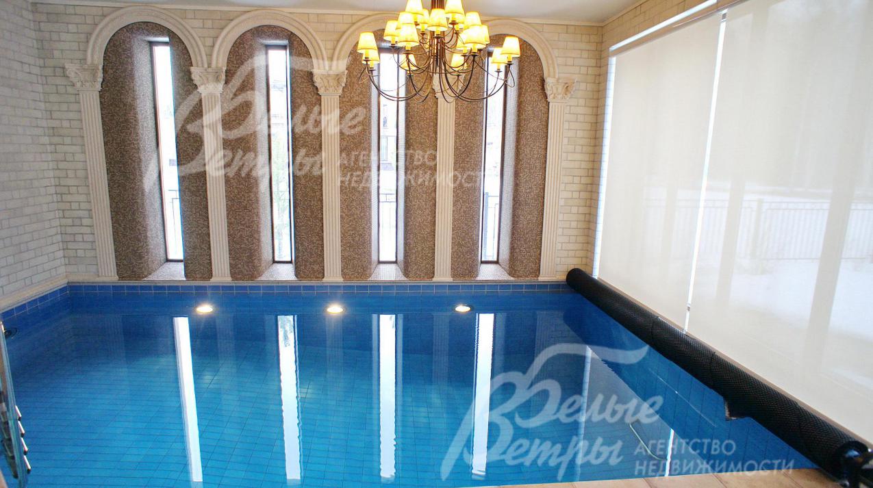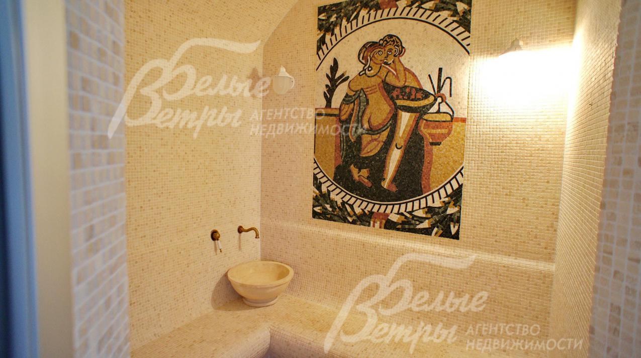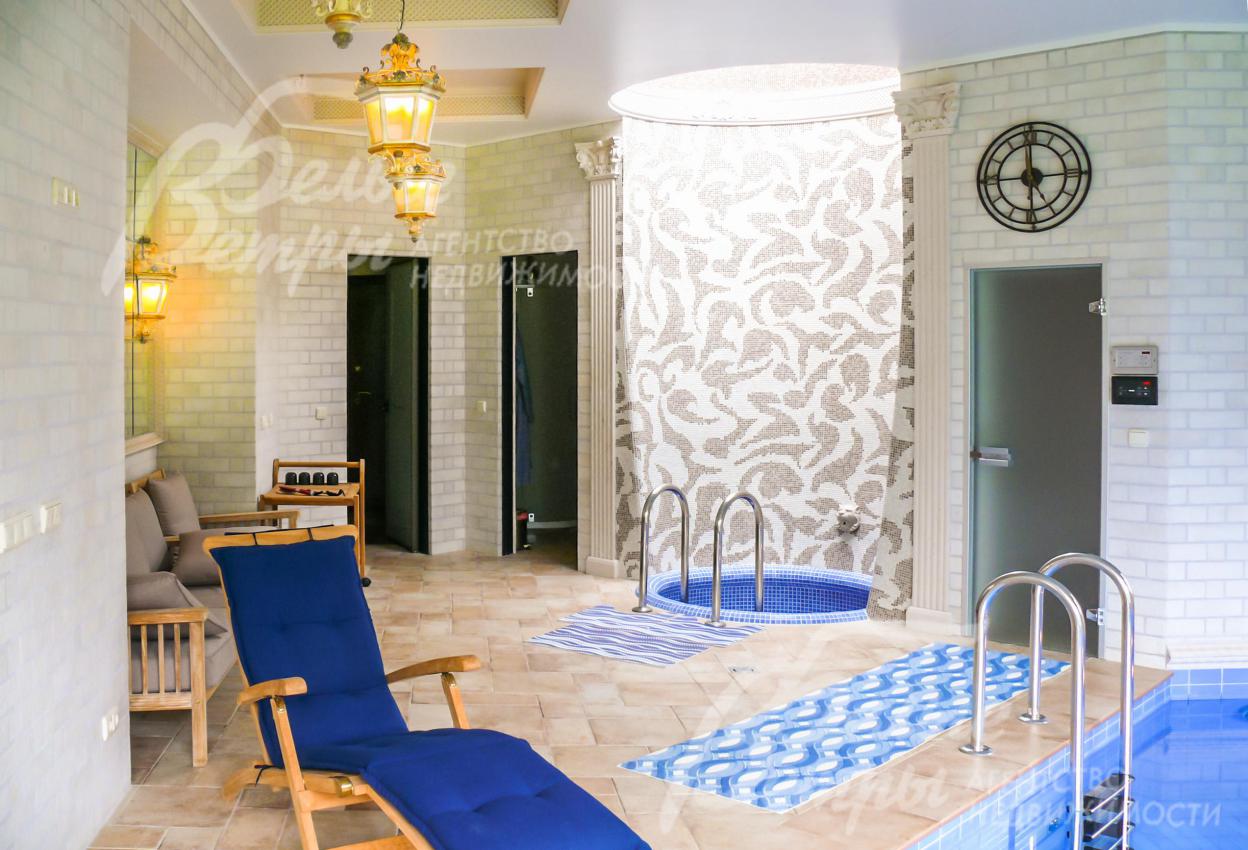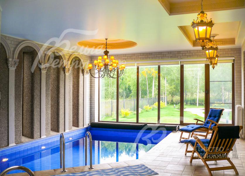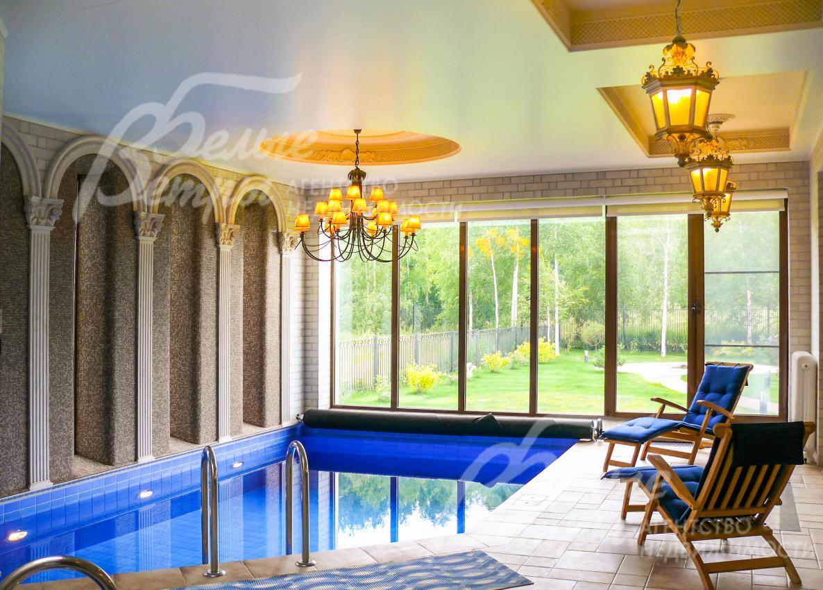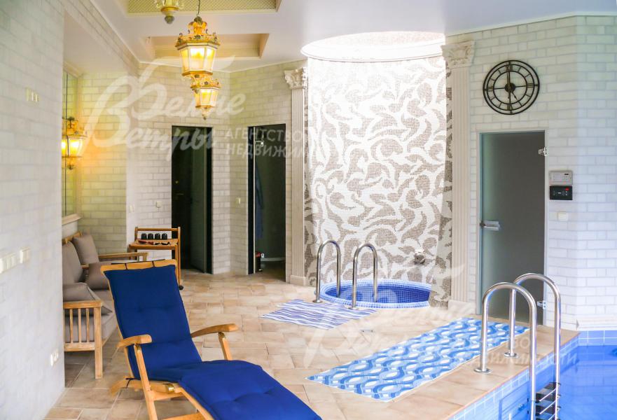 СПА зона: зона бассейна 44.6 кв.м с бассейном 5.5 х 3.5 м с круглой купелью (над купелью зинитный фонарь), хамам 3.6 кв.м, предбанник 4.5 кв.м с душевой, парная 5 кв.м, раздевалка 4.9 кв.м с с/у