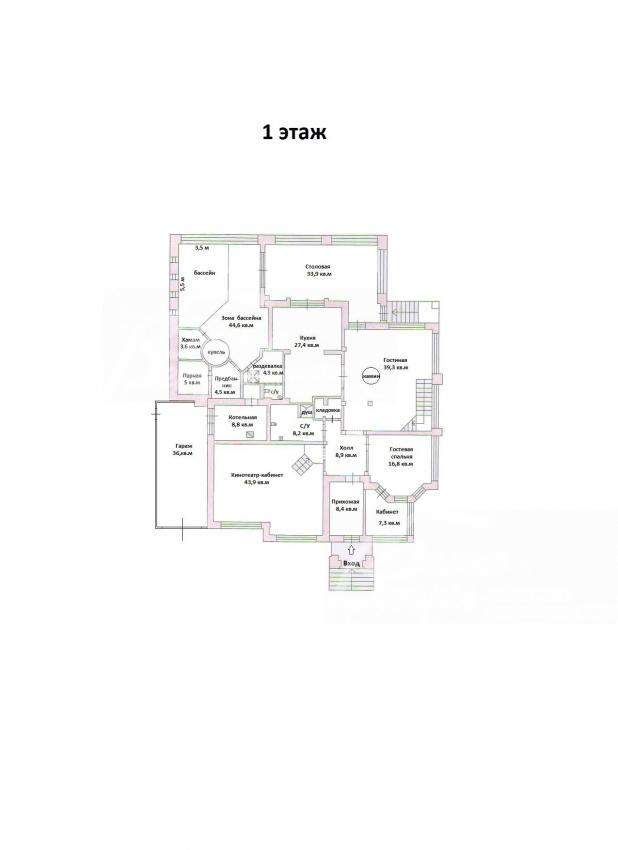 1-ый этаж: прихожая 8.4 кв.м, холл 8.9 кв.м, гостиная 39.3 кв.м со вторым светом и с металлическим круглым камином (остекление по кругу - эффект "костра"), кухня 27.4 кв.м с островом, столовая 33.9 кв.м с выходом на террасу, гостевая спальня 16.8 кв.м с кабинетом 7.3 кв.м, кинотеатр-кабинет 43.9 кв.м, с/у 8.2 кв.м с душем, кладовая