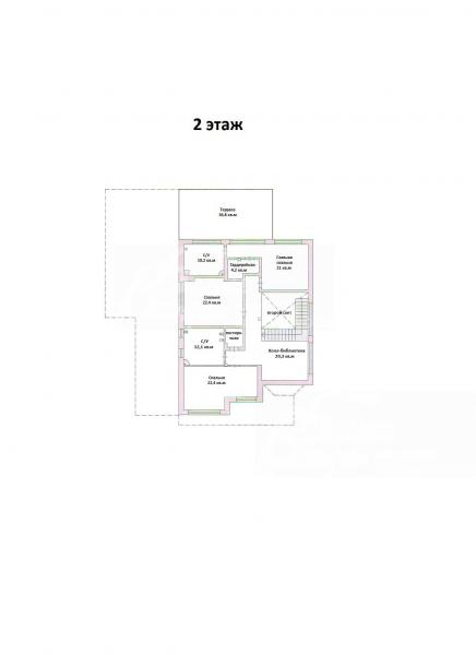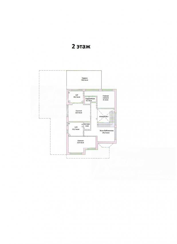 2-ой этаж: холл-библиотека 29.3 кв.м, спальня 22.4 кв.м, общий с/у 12.1 кв.м с ванной, постирочная, спальня 22.44 кв.м, главная спальня 21 кв.м с с/у 10.2 кв.м (ванная с гидромассажем, душевая кабина с хамамом) и с гардеробной 4.2 кв.м, с собственным выходом на террасу 36.8 кв.м (вид на лес и поле)