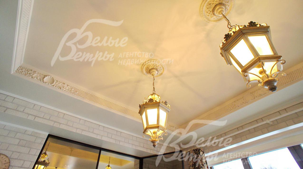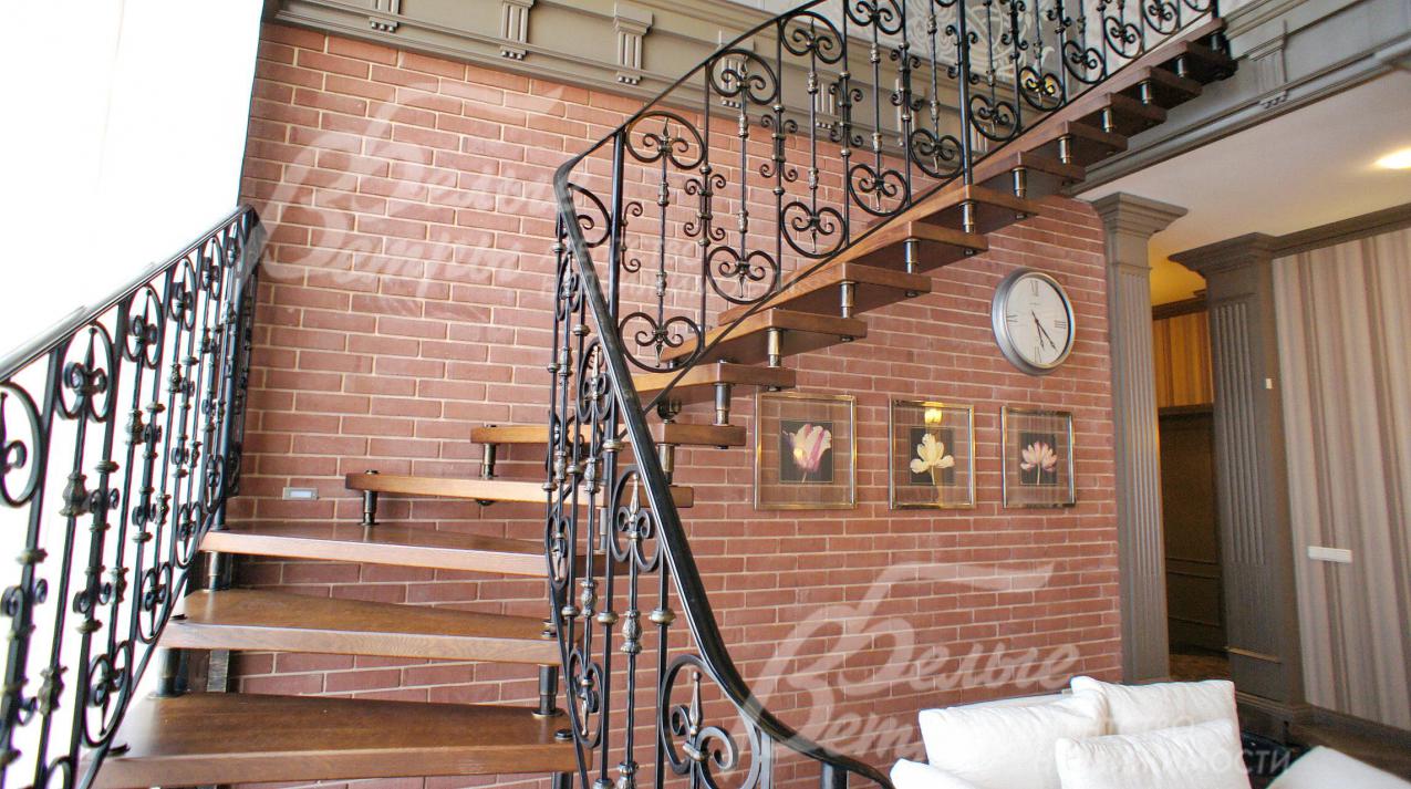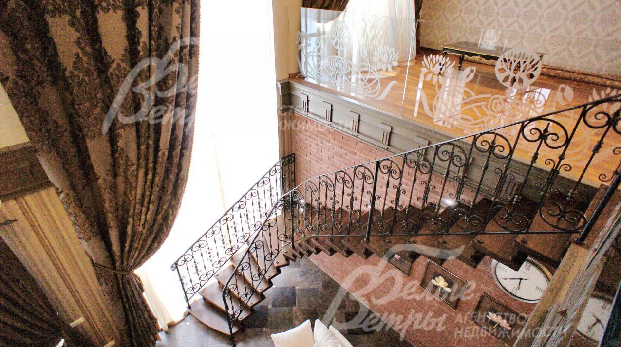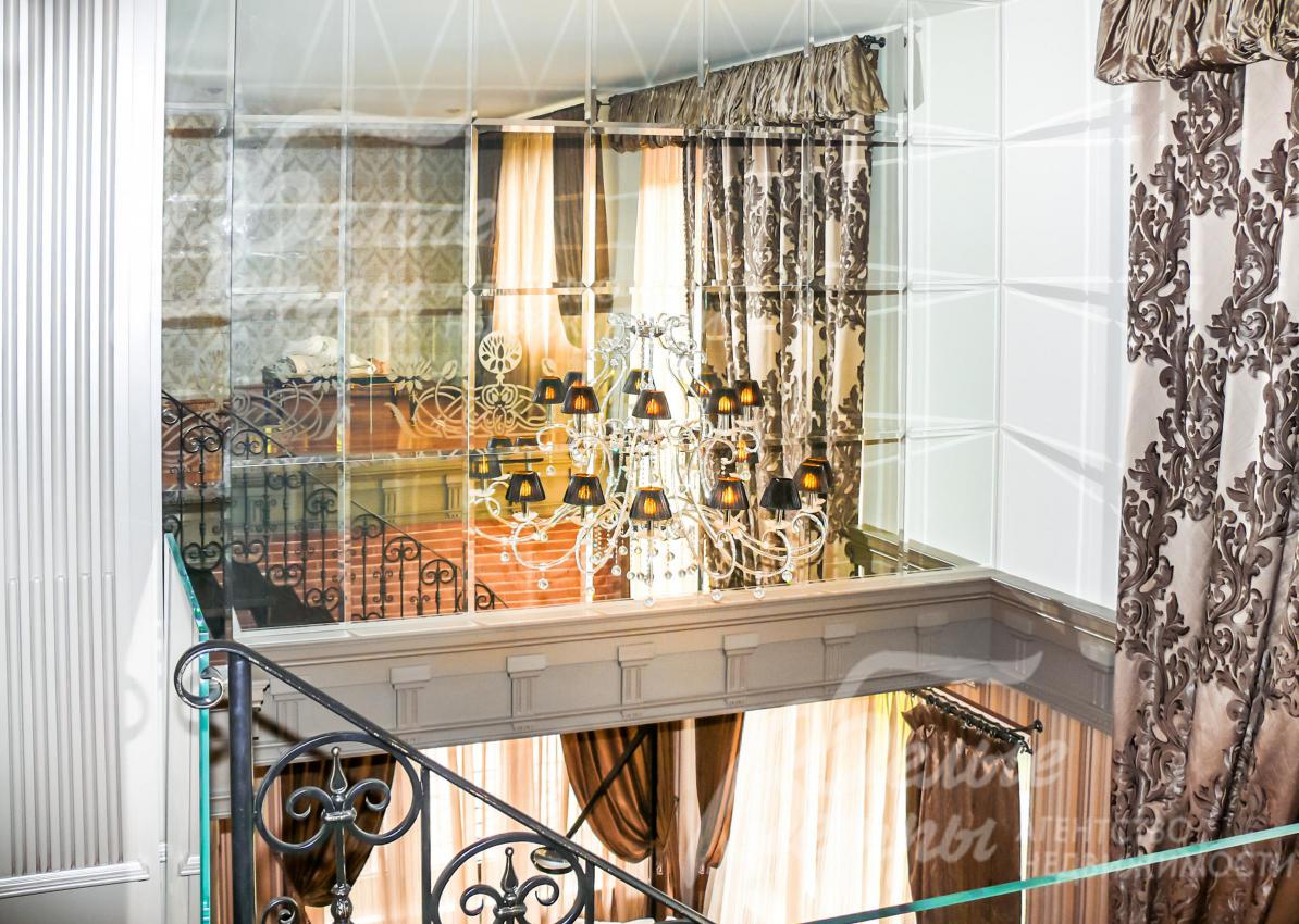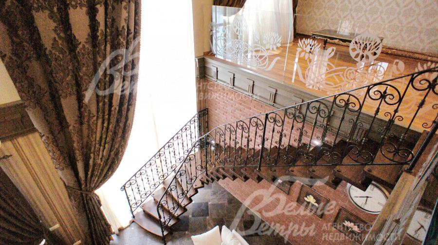 Лестница поворотная на больцах легкая, ступени дубовые, перила кованные. Потолки многоуровневые с различной подсветкой, украшены лепниной и деревянными элементами.