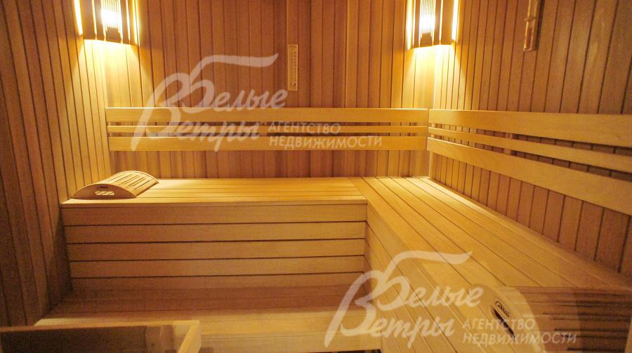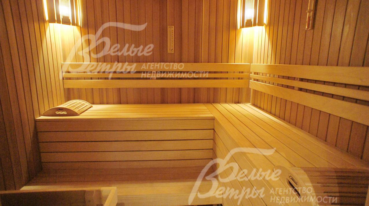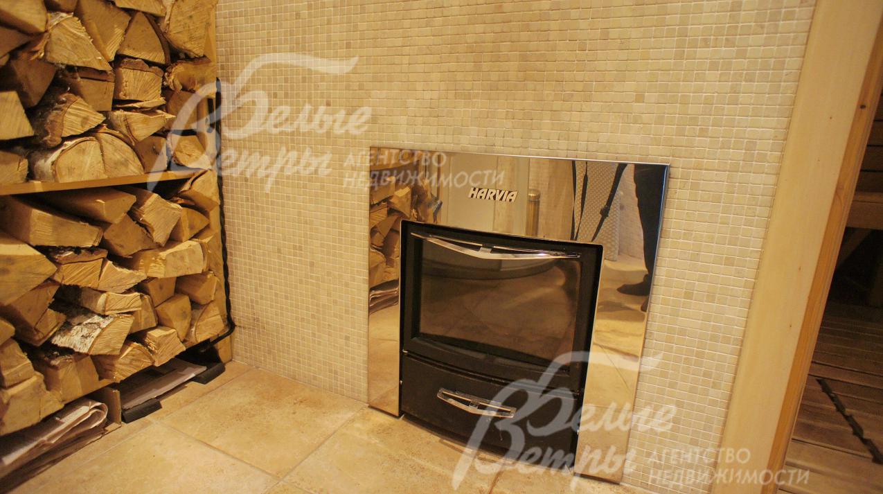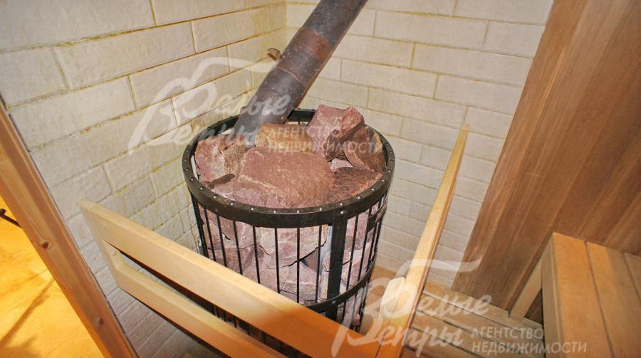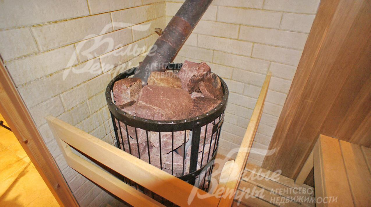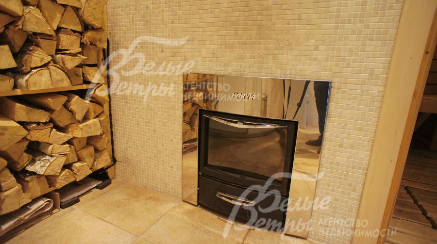 Дровенная печь в сауне заполнена лечебным камнем Малиновым кварцитом. В жилых общих зонах установлена аудио система.