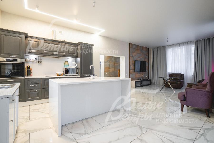 Мебель, оборудование: установлен кухонный гарнитур фирмы Мария: дубовые фасады, встроенная техника Bosch, столешница из акрилового камня. На потолке - точечные споты, люстры.