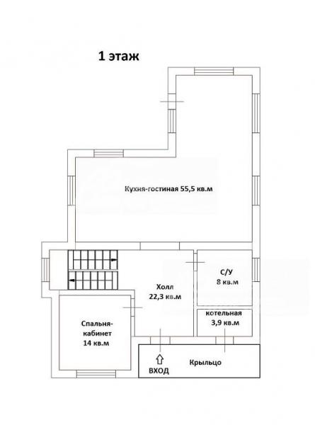 1-ый этаж: крытое крыльцо, холл 22,3 кв.м., гостиная- кухня-столовая 55,5 кв м с выходом на задний двор с террасой, гостевая спальня 14 кв м, санузел 8 кв м (с душевой), котельная с отдельным входом 4 кв.м.